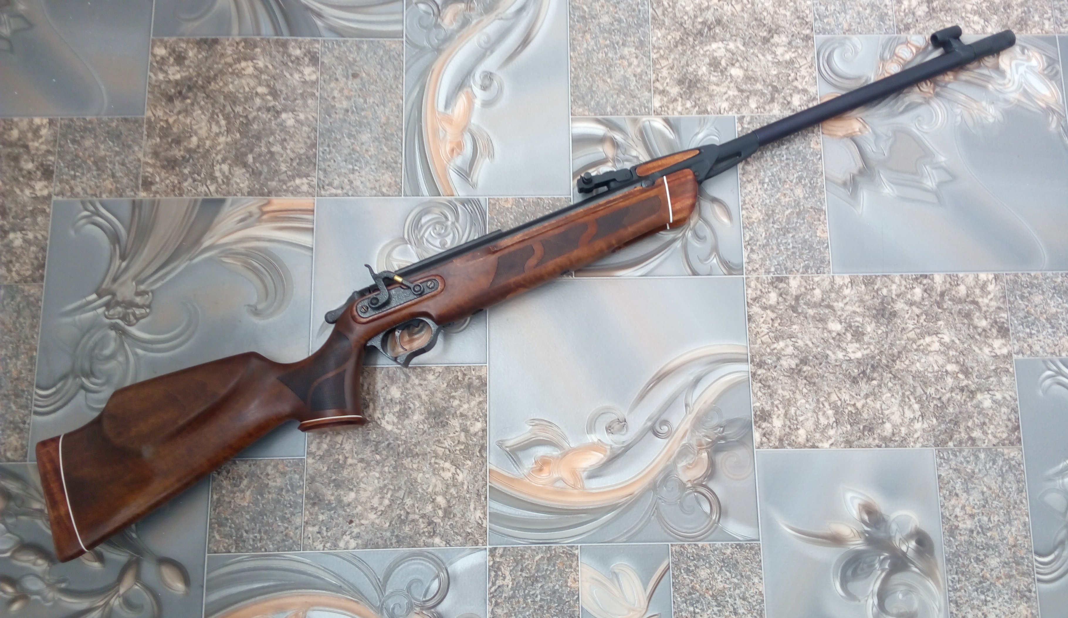 Обдумывал чтобы такое ему сваять, вспомнил что ка-то прикупил на нашей барахолочке ложу ореховую от турецкой РСР винтовки «KRAL». Конкретно для чего-то я тогда её не брал. Взял именно на «а вдруг сгодится», тем более цена была вполне приемлема за неё. Решил попробовать именно её адаптировать для «Мурки». Примерил-конечно очень не подходила. Но если доработать-вполне годной обещала стать. Ну принялся дорабатывать.