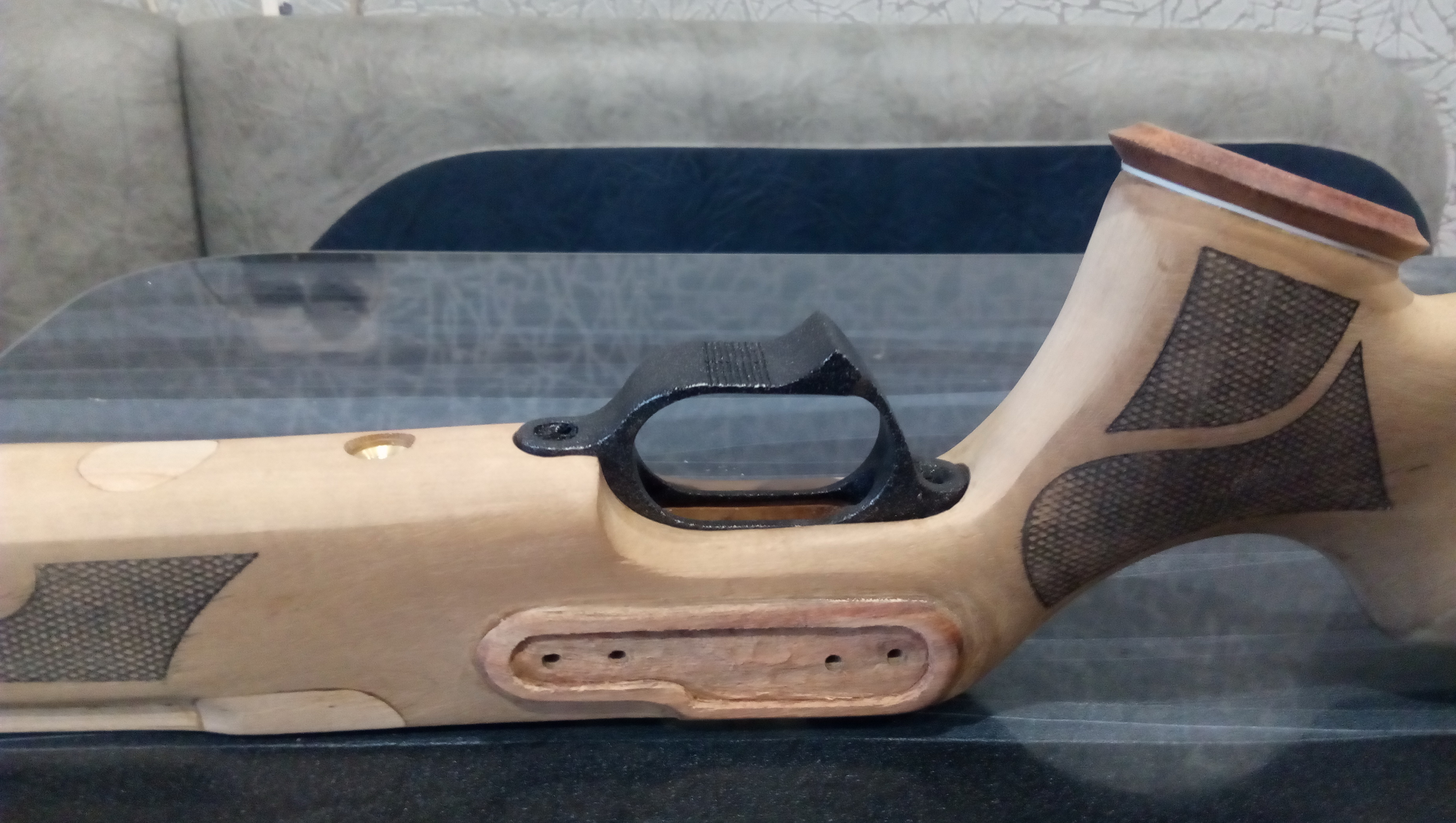 Обдумывал чтобы такое ему сваять, вспомнил что ка-то прикупил на нашей барахолочке ложу ореховую от турецкой РСР винтовки «KRAL». Конкретно для чего-то я тогда её не брал. Взял именно на «а вдруг сгодится», тем более цена была вполне приемлема за неё. Решил попробовать именно её адаптировать для «Мурки». Примерил-конечно очень не подходила. Но если доработать-вполне годной обещала стать. Ну принялся дорабатывать.