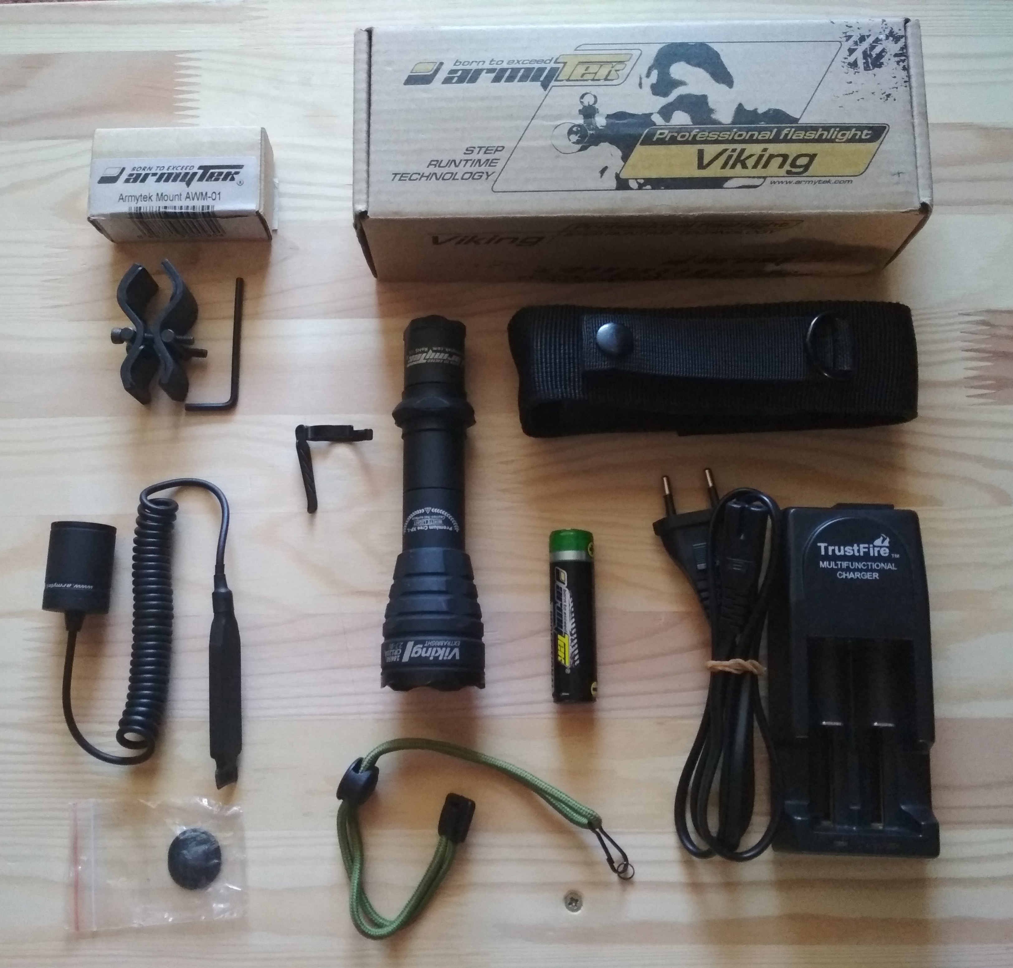 Очень хороший комплект: фонарь, коробка, инструкция, ремкомплект, чехол, оригинальный АКБ 3100 mAh, зарядное устройство для АКБ, выносная кнопка, крепление на оружие.