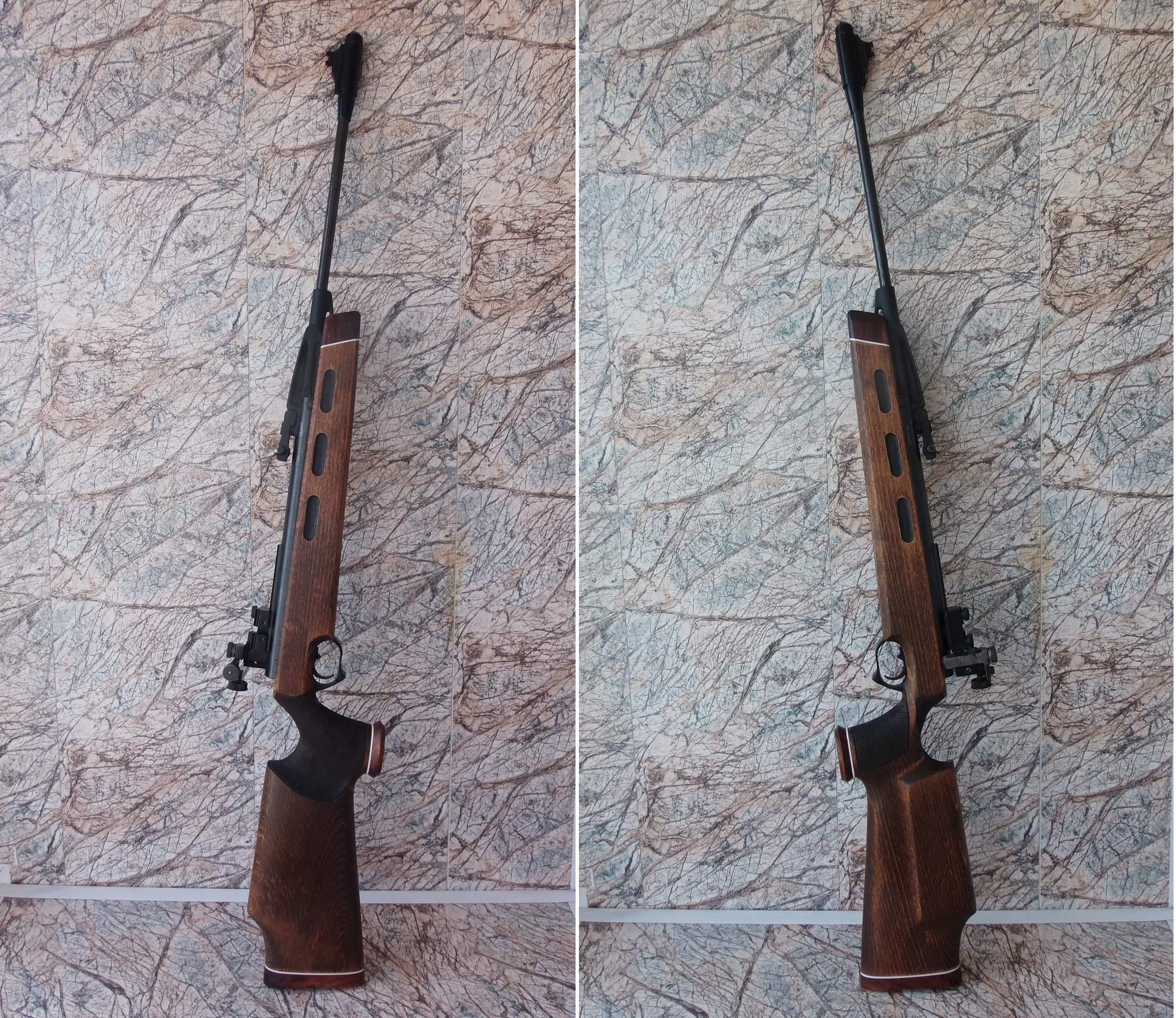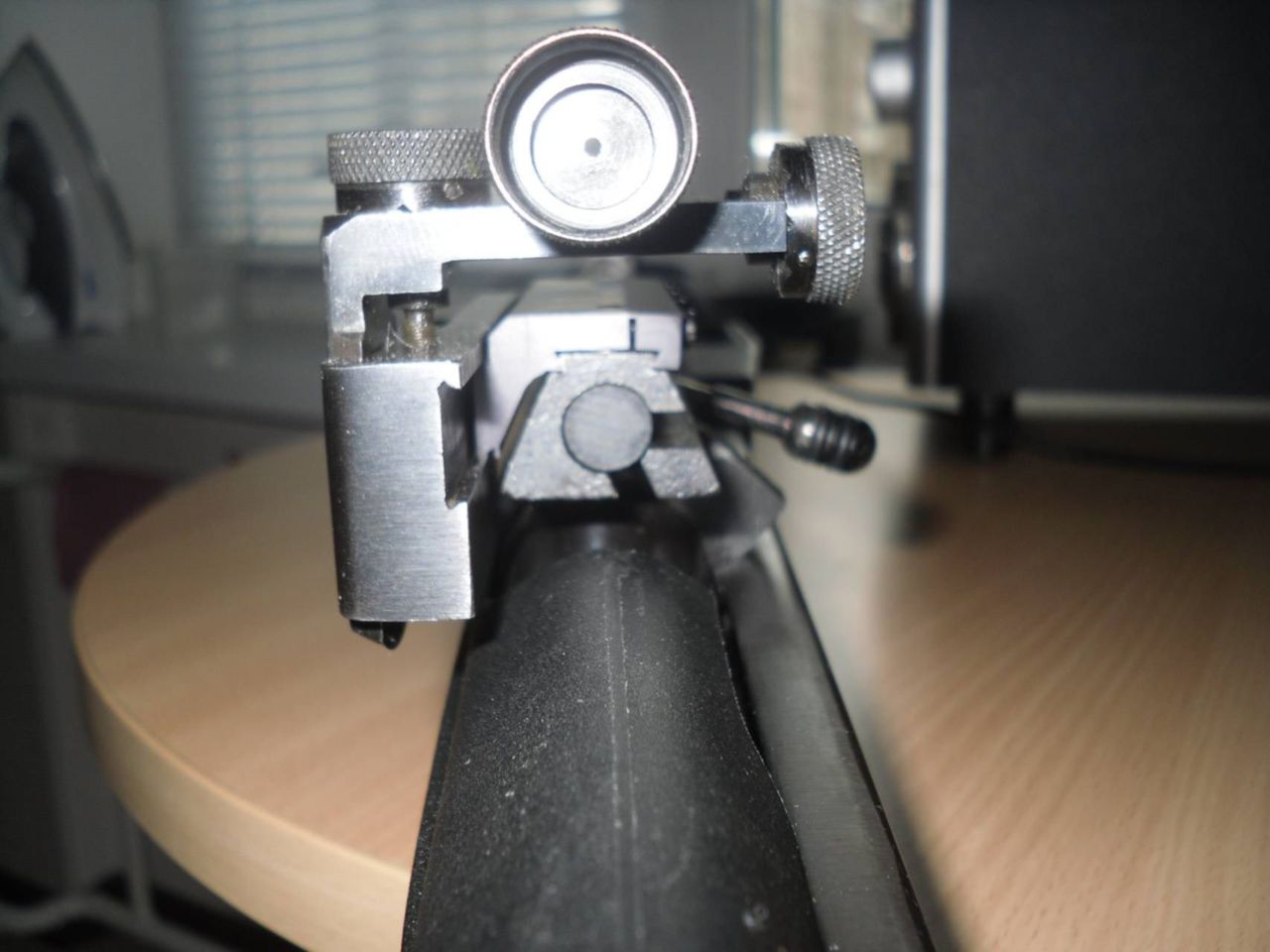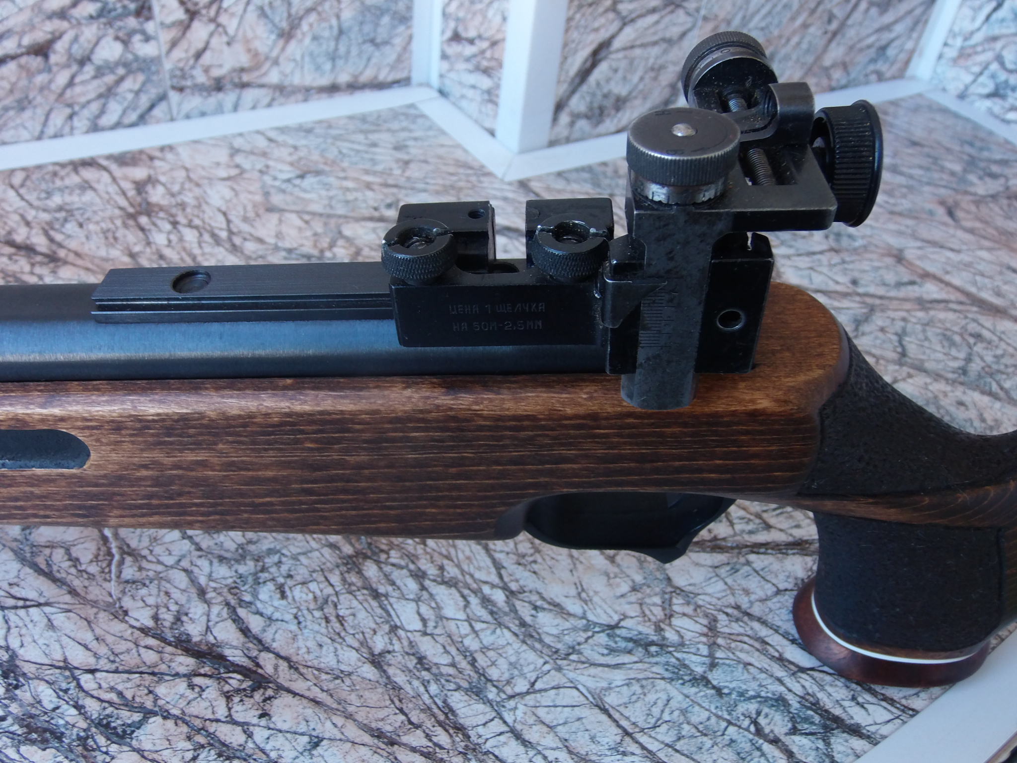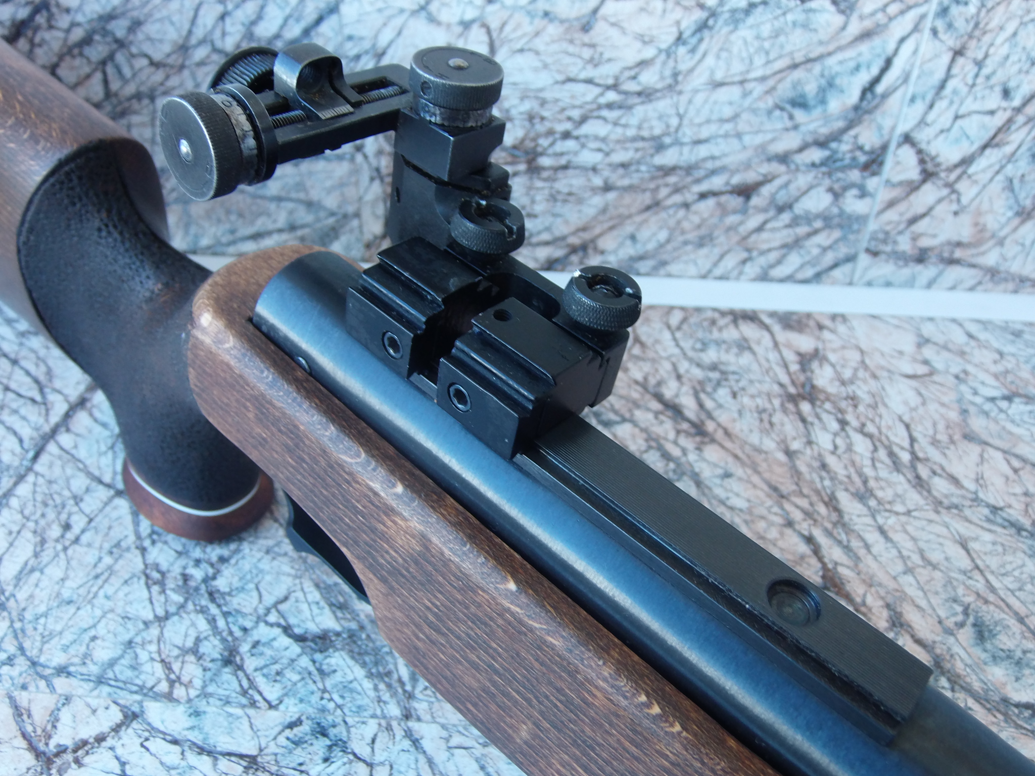 Я закрепил диоптр с боковым креплением на свой распиленный надвое. Вышло отменно! Высота диоптра оптимальна и прицеливание комфортно. В этом переходнике есть и стопорный гужончик-он не даст ёрзать прицелу взад-вперёд. Короче нормальная штука! Вот примерно как это стало на недавно законченной "Мурке":
