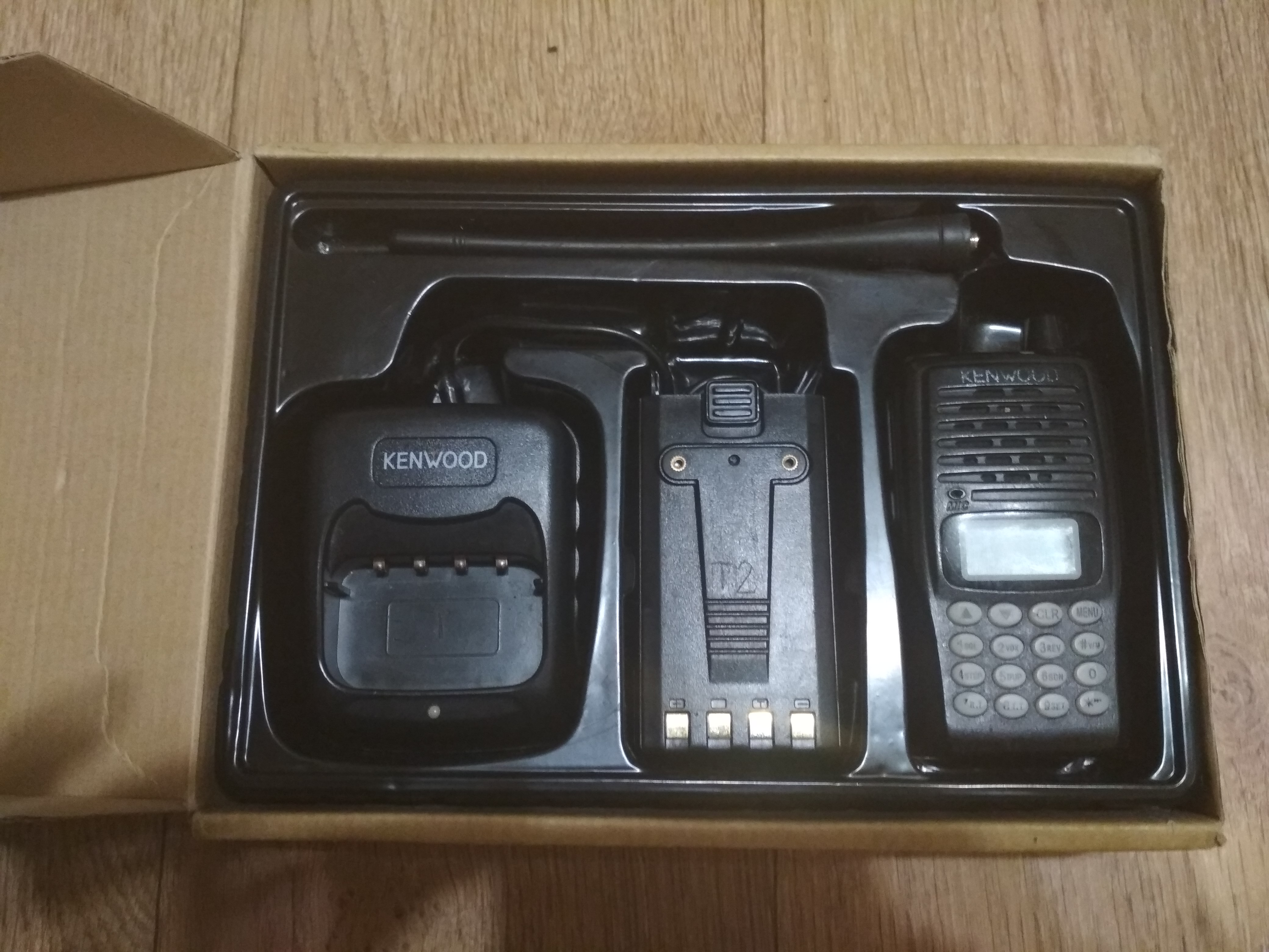 Полный заводской комплект (радиостанция, батарея, зарядное устройство, клипса) + дополнительная батарея.