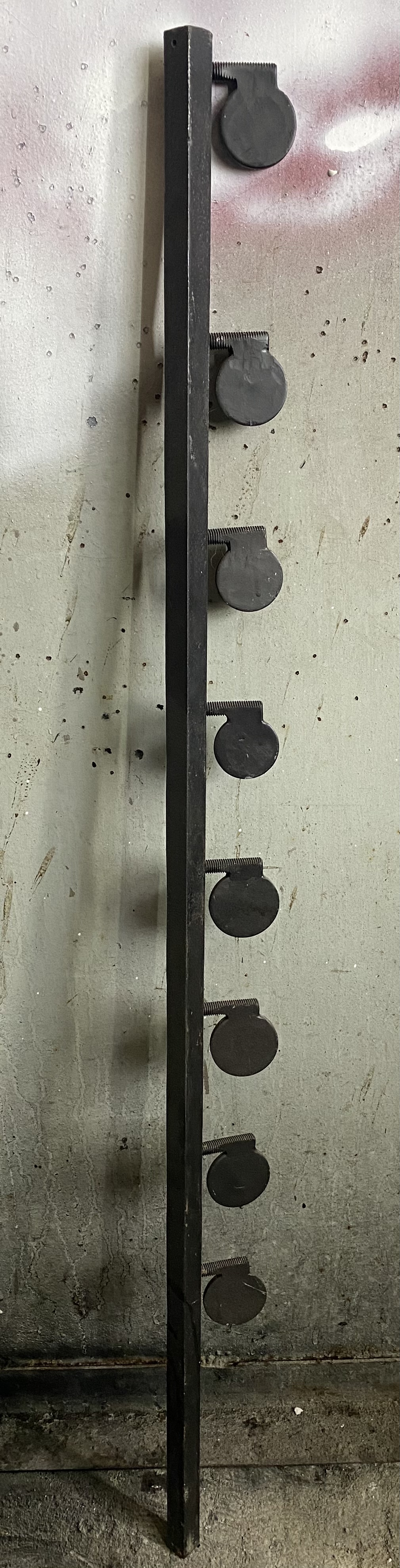 Уголок 25 или 30. Точно не помню. Пятаки пополам чуть поменьше и побольше. Верхние меньше.