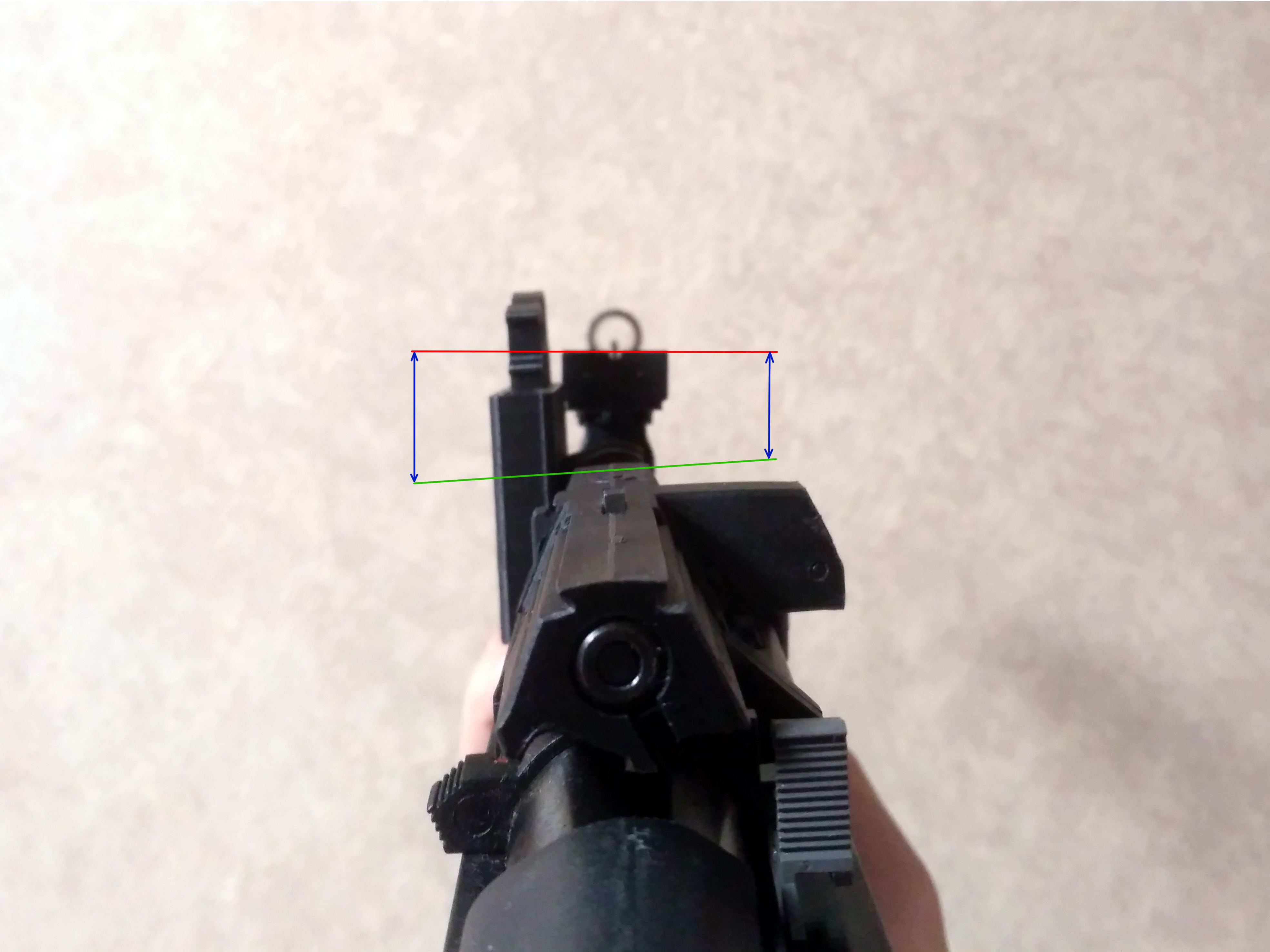 3) помимо смещения вправо, ствол идет еще и под углом относительно цевья, если смотреть сверху