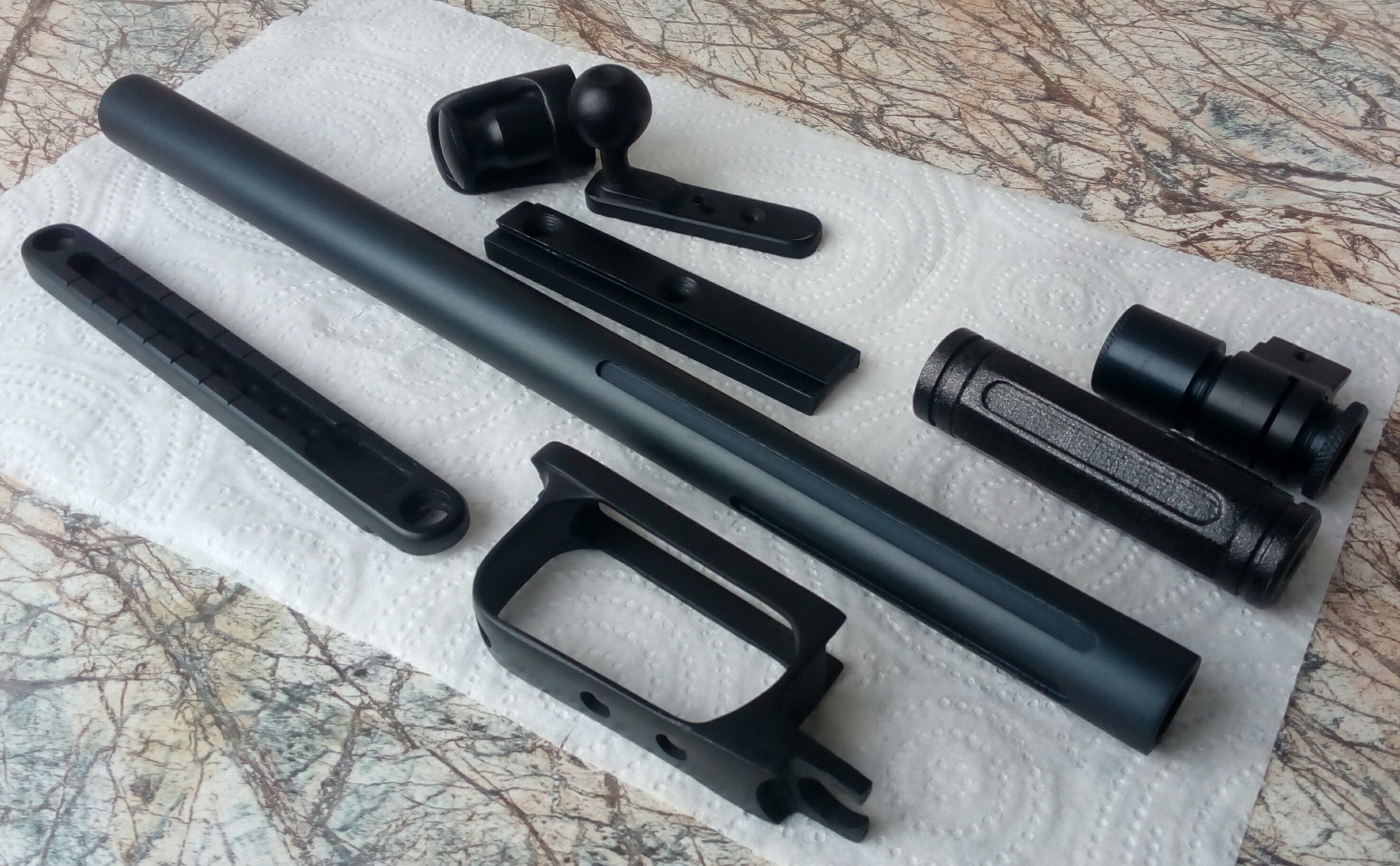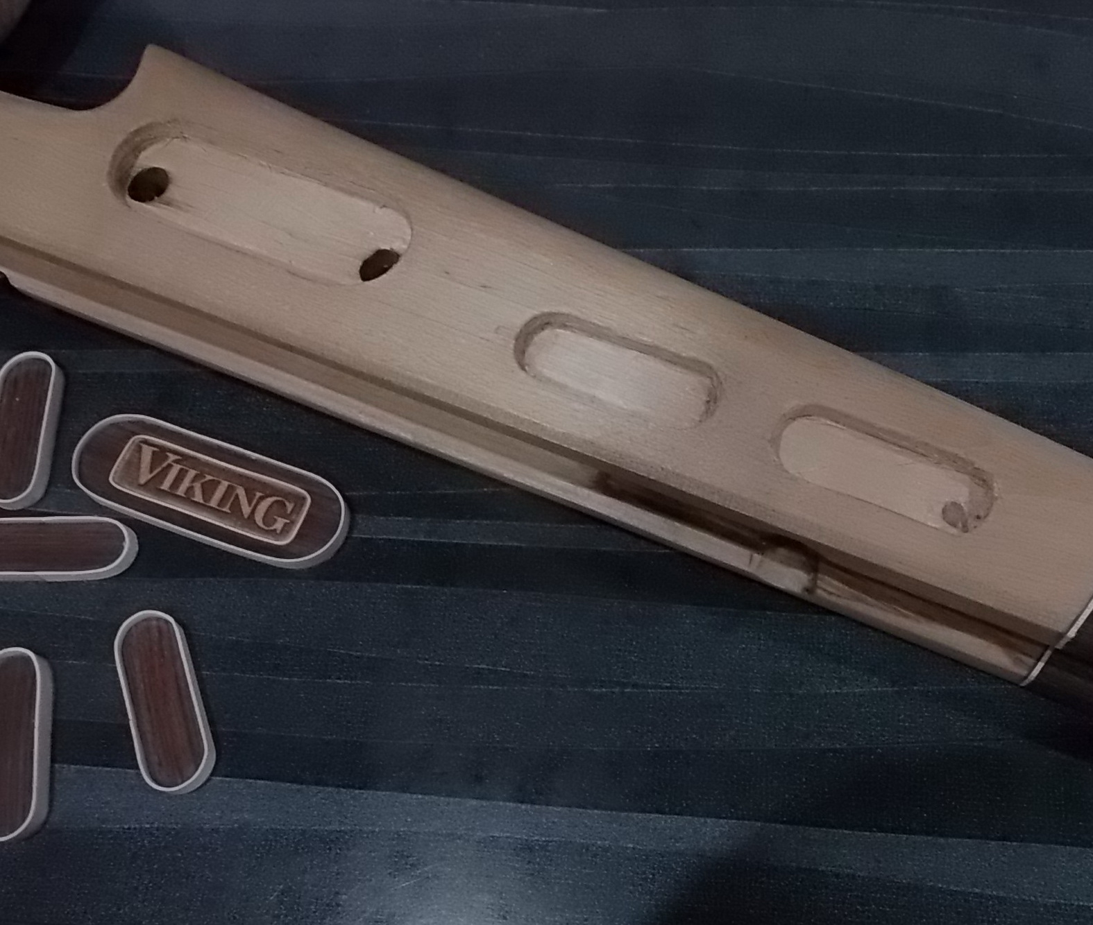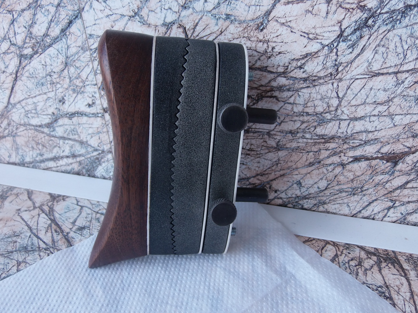 Отмочил сначала ложу в ацетоновой бане, затем протёр чистым ацетоном и отшкурил всю ложу бумажками от Р60 до Р320. Затыльника к ложе в комплекте не было, не было и еврошины. Спусковая скоба из алюминия была. Совместными усилиями с дружком Русланом соорудили регулируемый затыльник. Решили сделать его регулируемым и по высоте и по длине. Он напечатал из хорошего пластика три детали затыльника-к основе крепился с задней стороны двумя саморезами на клею деревянный затыльник. Для него и (забегая наперёд) прочего декора этой ложи я отыскал красивый брусок из экзотической породы. Средняя деталь-ответная половинка первой с шпоночным пазом куда вложена гайка М6 под винт фиксации затыльника при регулировке по высоте. Т.е. в затыльнике деревянном и детали к которой он закреплён просверлено сквозное отверстие под винт. Ослабишь винт-выставив на нужную высоту затыльник винт затянешь. Затыльник останется зафиксированным в выбранном по высоте положении. Регулировка выполняется не на ластохвосте, а на соединении «крокодил» что намного надёжнее-фиксация мёртвая просто!!! Также во вторую деталь были врезаны две шпильки стальные для регулировки по длине. Третья деталь крепится непосредственно к затыльнику двумя винтами с потайными головками во втулки врезанные в затыльник приклада. Также эта деталь оснащена двумя втулками под шпильки средней детали и двумя втулками в боковине правой под маховички стальные для фиксации выдвинутого по длине затыльника. Маховики стальные при закручивании упираются в стальные шпильки и надёжно фиксируют затыльник в нужном положении по длине. Для беспрепятственного перемещения шпилек внутри приклада выполнен необходимый паз. Вот таким был сначала затыльник и вот таким он стал в итоге. Варианты регулировок продемонстрированы:
