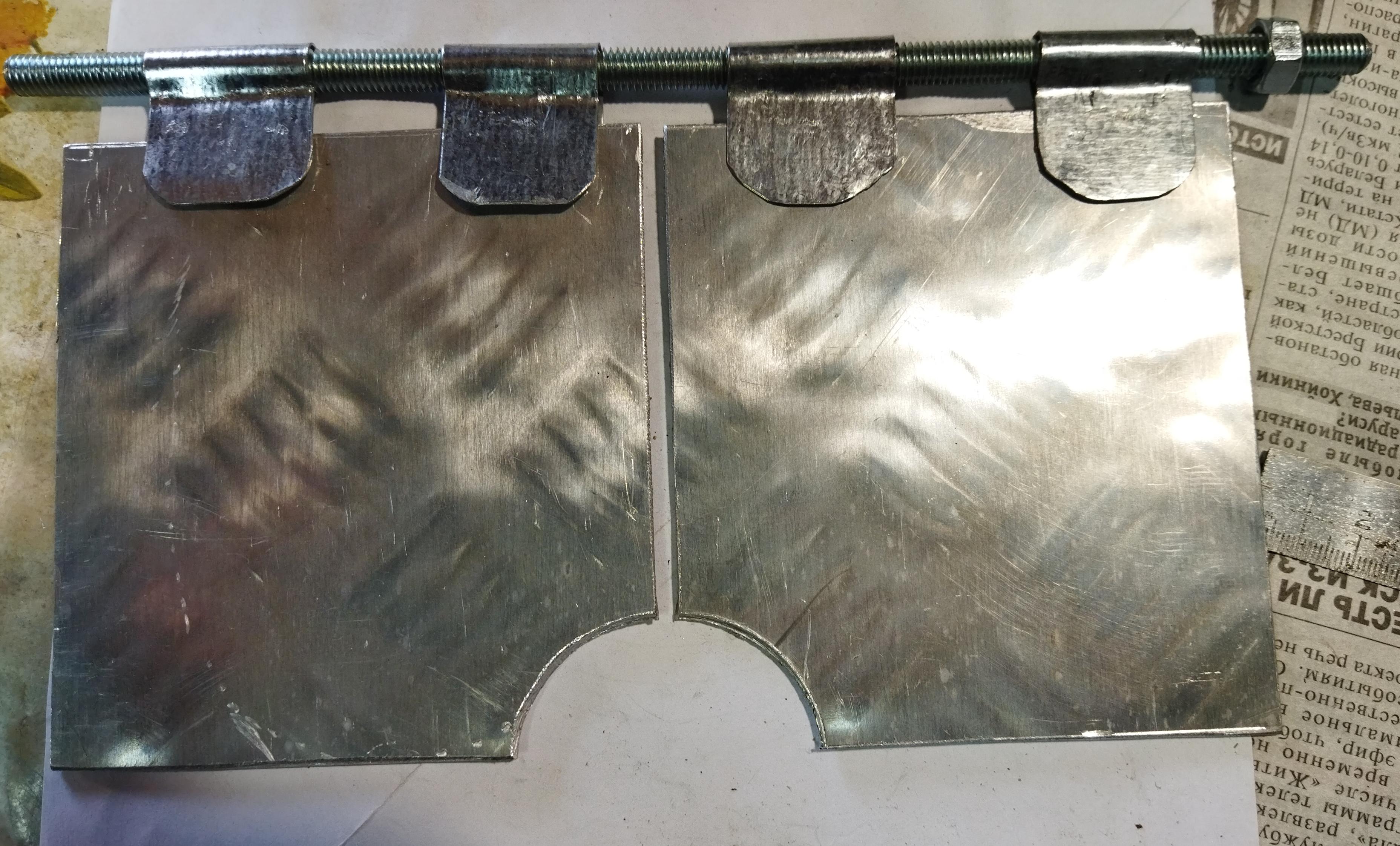Все разбирается и собирается - минуты. Гайки на осях позволяют регулировать и фиксировать положение секторов по горизонтали. Осями являются шпильки М8 от тех же креплений лотков. Сектора вырезаны из куска листового алюминия, тоже от чего то остался. Петли согнуты из жести оцинковки. Крепятся потом на заклепки.