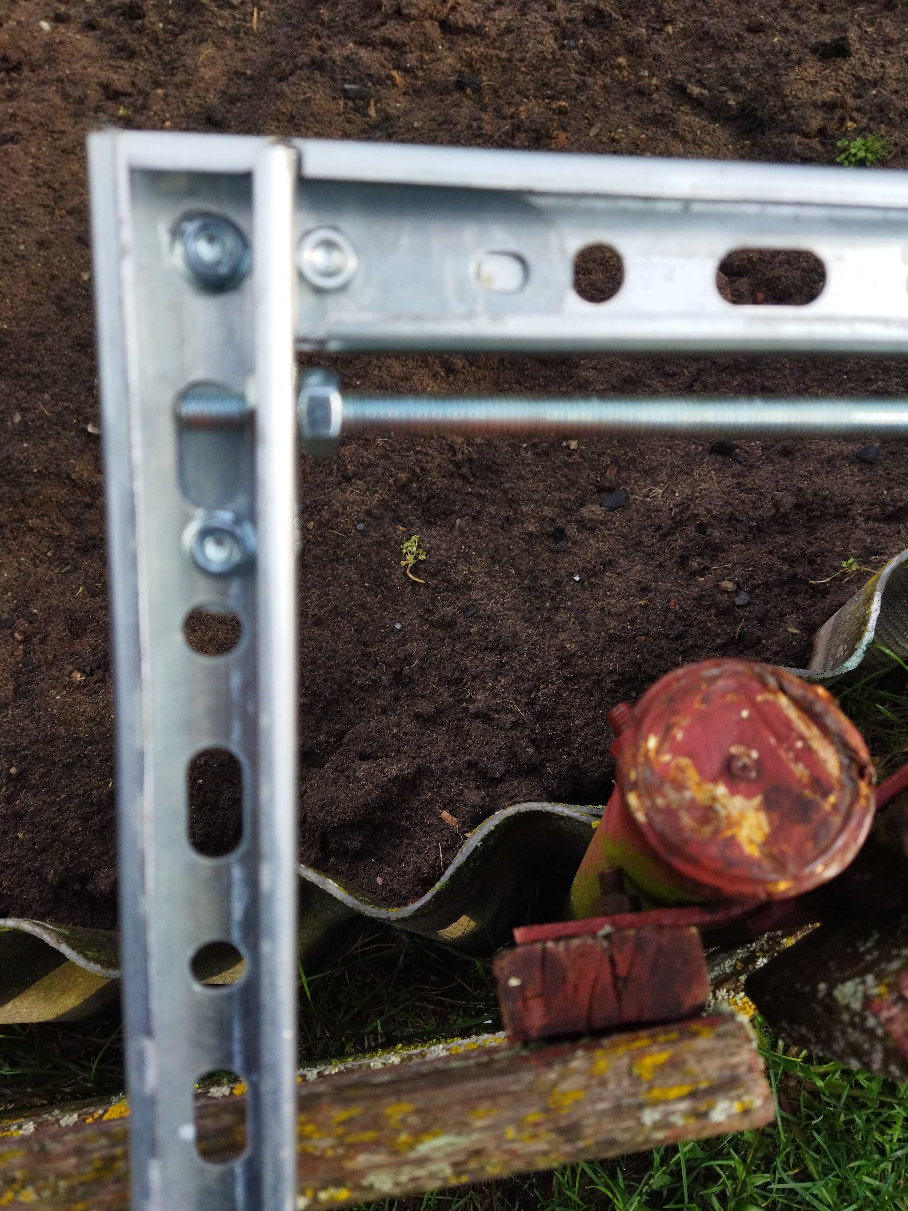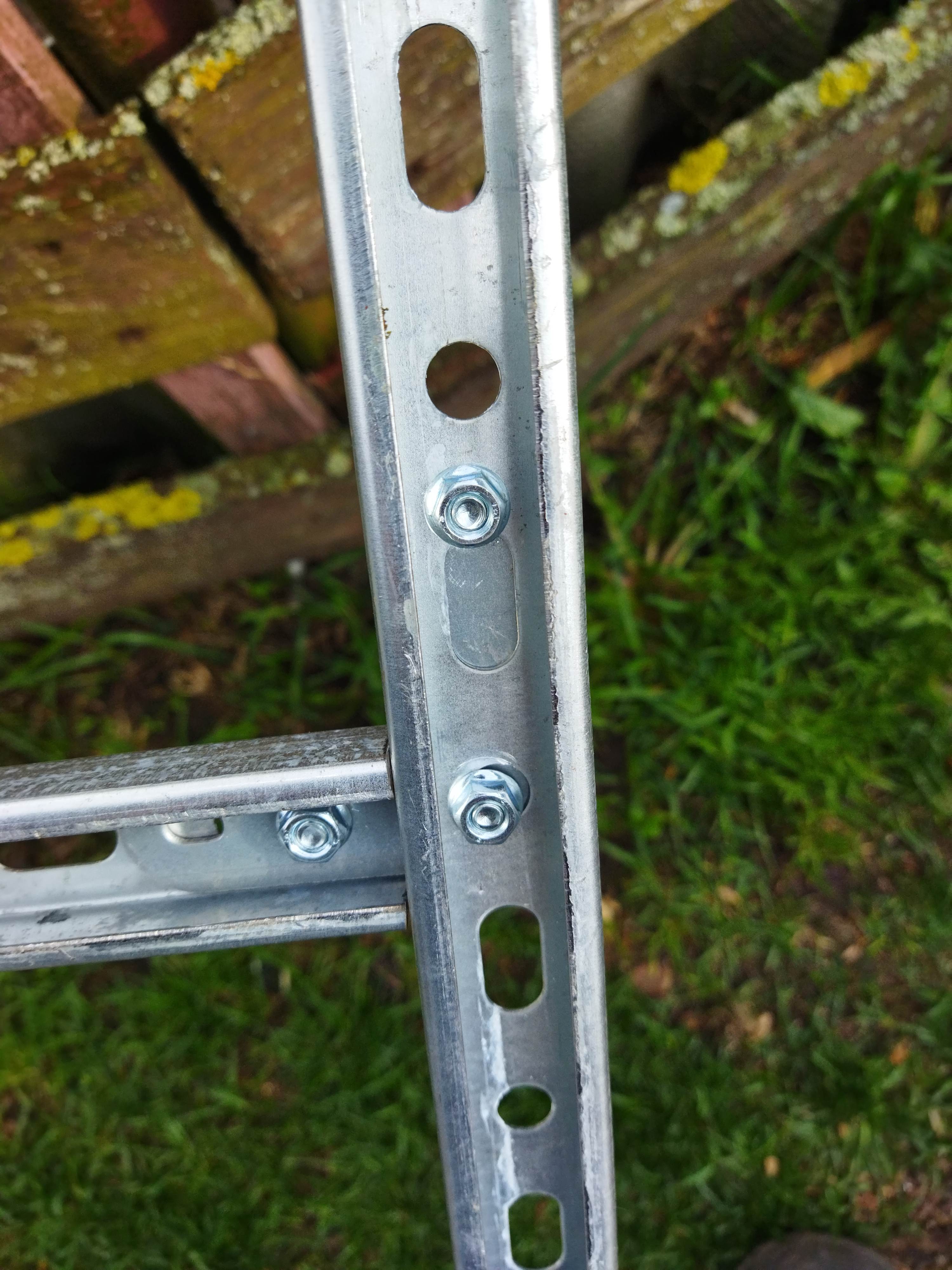 Рама собрана из "П-образного" профиля. Эти же профиля и являются "ногами". Соединение рамки винтами с гайками М6. Даже сверлить ничего не надо. Используется штатная перфорация профиля. Сверлилось только отверстие под крепление горизонтальных осей. Углы "усилились" пластинами "Г-образными", остались от сборки какого то металлического стеллажа?