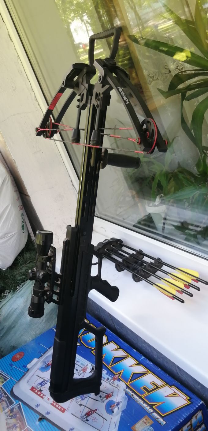 Арбалет Man Kung, разрешенные плечи 43кг, прицел 4х32, кивер с 4 новыми дюралевыми стрелами, установлена тактическая рукоятка, в наличии родное цевьё и ремень