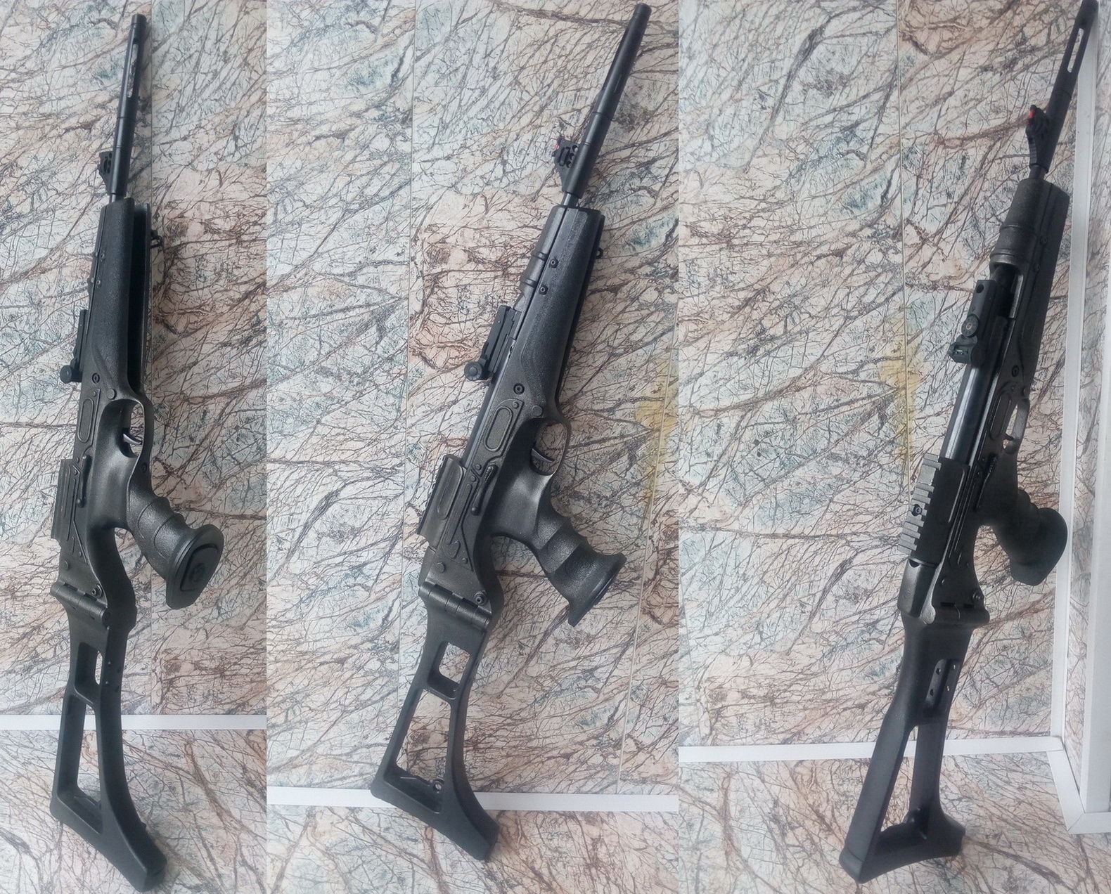 Его (ремешок) купил у тех же страйкболистов. А вдруг парень захочет двухточечный ремешок? Такой в тон работы чёрненький с чёрными карабинами у меня как раз был. Значит надо врезать две антабки под него! Куда? Одну конечно сбоку на цевье, вторую сбоку на прикладе. В задней части приклада снизу перед затыльником имелись два тонких «крыла». Неоднократно видел такие приклады с погрызанными будто этими «крыльями»-весьма уязвимое место этих прикладов. Чтобы исключить поломку этих крыльев, решил залить пустоту между ними. Это несомненно усиливало конструкцию приклада и давало возможность врезать туда винт антабки. Нет! Конечно можно было закрепить задний карабин в ушке пластиковом в нижней части рамки,но….. Пластик сотрётся о карабин очень быстро. Поэтому конечно только стальные антабки!!! Применил две антабки от «МР-654» старых образцов, только выточил новые винты под антабки-родные были ну ооооооочень могучие. Сделал винты с резьбой М4. Просверлил отверстия Ф3.2мм слева в передке цевья и слева в залитой смесью ЭДП и дерев.опилок пустоткой между «крыльев». Нарезал резьбу М4 и смазав винты ЭДП, врезал их на резьбе в эти отверстия. После высыхания антабки просто мёртво вросли. Ну а залитая шпаклёвкой пустотка была аккуратно обработана наждачками и конструкция стала жёсткой и будто так было изначально. Вот так всё примерно выглядело-передняя антабка в носу цевья слева и задняя врезана в залитые «крылья». Так было до и после окрашивания. Думаю вполне достойно, а главное надёжные узлы вышли: