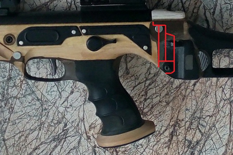 Сверху за «стаканом» с планкой я решил сделать более законченной конструкцию-сделал из пластика простенький задник. В деревяшке он крепится на врезанную шпильку/саморез-врезал её снизу на ЭДП, а посередине крепится в железяку внутри приклада. Просверлил отверстие через изготовленный задник сверху в нутро приклада(там металл), нарезал резьбу М5 и на ЭДП+винт под шлиц закрепил этот задник в ложу шпилькой, а посередине винтом М5 под шлиц, намазав его клеем ЭДП. После высыхания обработал всё наждачкой, шляпку винта залил клеем и зачистил. Стык приклада с ложей я старательно зашпаклевал ЭДП+метал.опилки и также старательно всё зачистил. Вот красным укажу примерное место зашпаклёванного стыка и такой задник у меня получился/таким он стал после окрашивания: