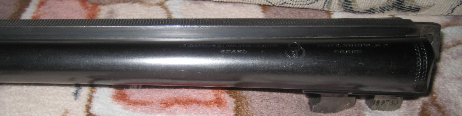 На стволах клейма "SPECIAL-GEWEHR-LAUF-STAHL", дальше - логотип "Три кольца", за ним FRIED KRUPP. A.G.ESSEN. На замке клеймо "J.P. Sauer&Sohn, Suhl". Длина стволов - 720 мм