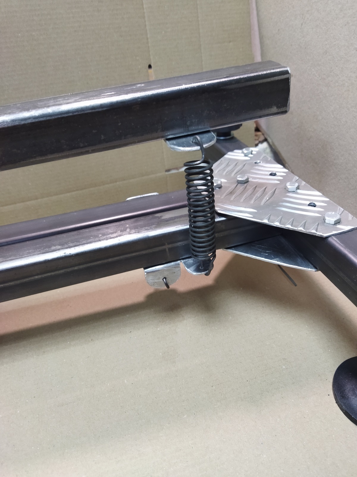 Центральная балка, задняя и передняя поперечины с вертикальными опорами, соединены алюминиевыми пластинами винтами М6х35. Эти же пластины служат опорой и креплением шарнира горизонтальной регулировки.