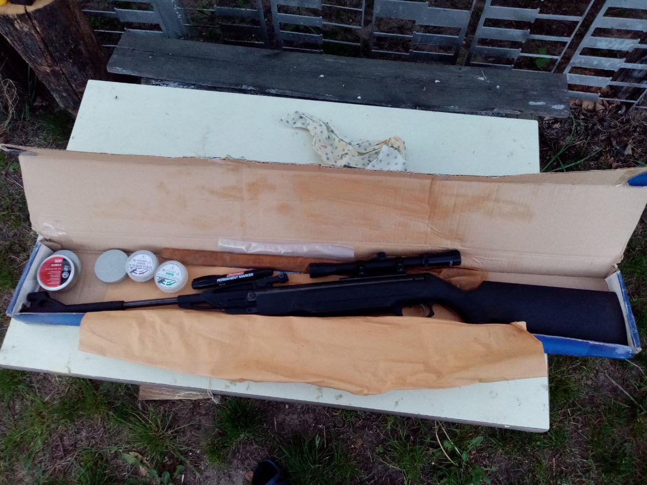 В комплекте коробка, оптический прицел, шомпол, масло, пульки (2х500 шт.), паспорт.