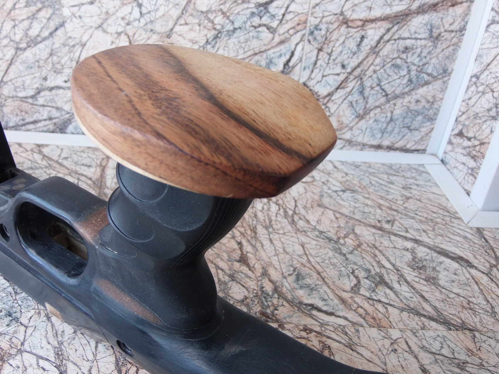 Конечно вы уже рассмотрели и пятку на рукояти-коротко о ней. Её решено было добавить и на этой работе. Их я делал и на недавно изготовленном «пистолете-пулемёте ИЖ-40» и на той самой снайперской винтовке которую показал в самом начале обзора. Пятка на манер немецкой «Н&K PSG-1»-(полицай снайпер гевер модель1). Мне по душе такие пяточки-весьма удобно расположена рука на рукояти и этой как бы полочке. Рука просто отдыхает-достаточно уложить ладонь на пятку и мягко обработать спуск указательным пальцем. В общем решил и сюда её приютить. Из обрезков собрал на клею заготовку, выпилил, сделал необходимую не слишком глубокую выборку под основание рукояти. Однако пятка одевалась на рукоять туго и с характерным щелчком. Обезжирил всё и обмазав хорошенько ЭДП, посадил пятку на рукоять, сразу из остатка клея сделал шпаклёвку с деревянными мелкими опилками и стыки вокруг обработал этим составом-слил пятку с рукоятью в единое целое. После застывания шпаклёвки всё обработал абразивами и вышло так. На сучок справа особо презрительно не смотрите-там всё зашпаклёвано, затёрто и после окрашивания от него и следа не останется. Вышло к слову всё весьма здорово, головку винта не видно: