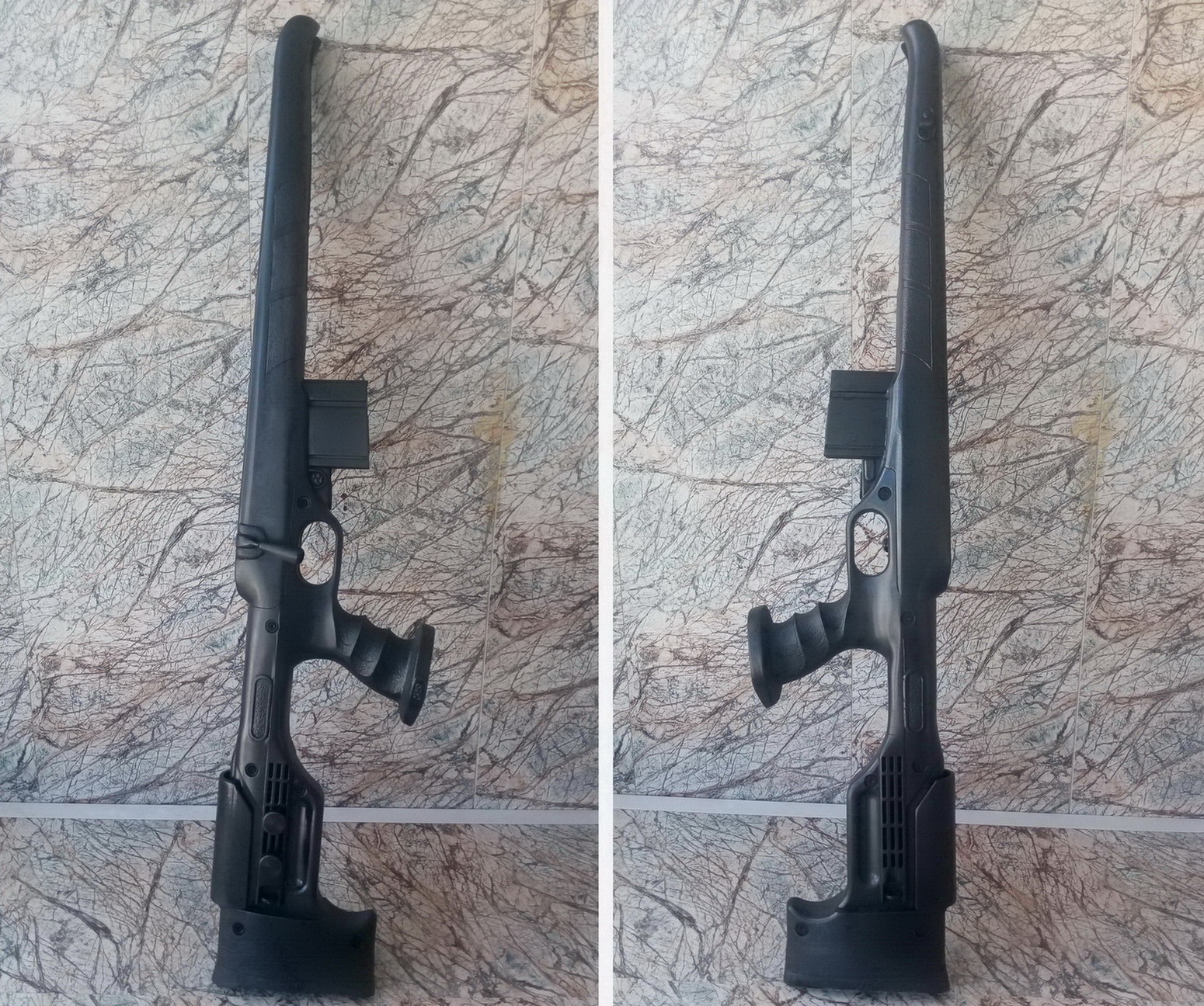 Ложа разбиралась без проблем на две половины( и приклад и основная часть)-это было большим плюсом. Ложа имела много рёбер жёсткости внутри, перегородки, отверстия, пустую шахту под магазин. Чтобы в эту ложу было возможно разместить «Мурку»-требовалось рёбра удалить, а всё остальное заделать вклейкой всяких вставок. К слову расположение шахты магазина( его в комплекте с ложей не было) лично у меня вызвало недоумение. Она была расположена настолько далеко к носу цевья, что элементарно не совпадала с окном экстракции гильз с правой стороны ложи. Не знаю кто это проектировал, но руки отбить не мешало бы))) Вот примерно: