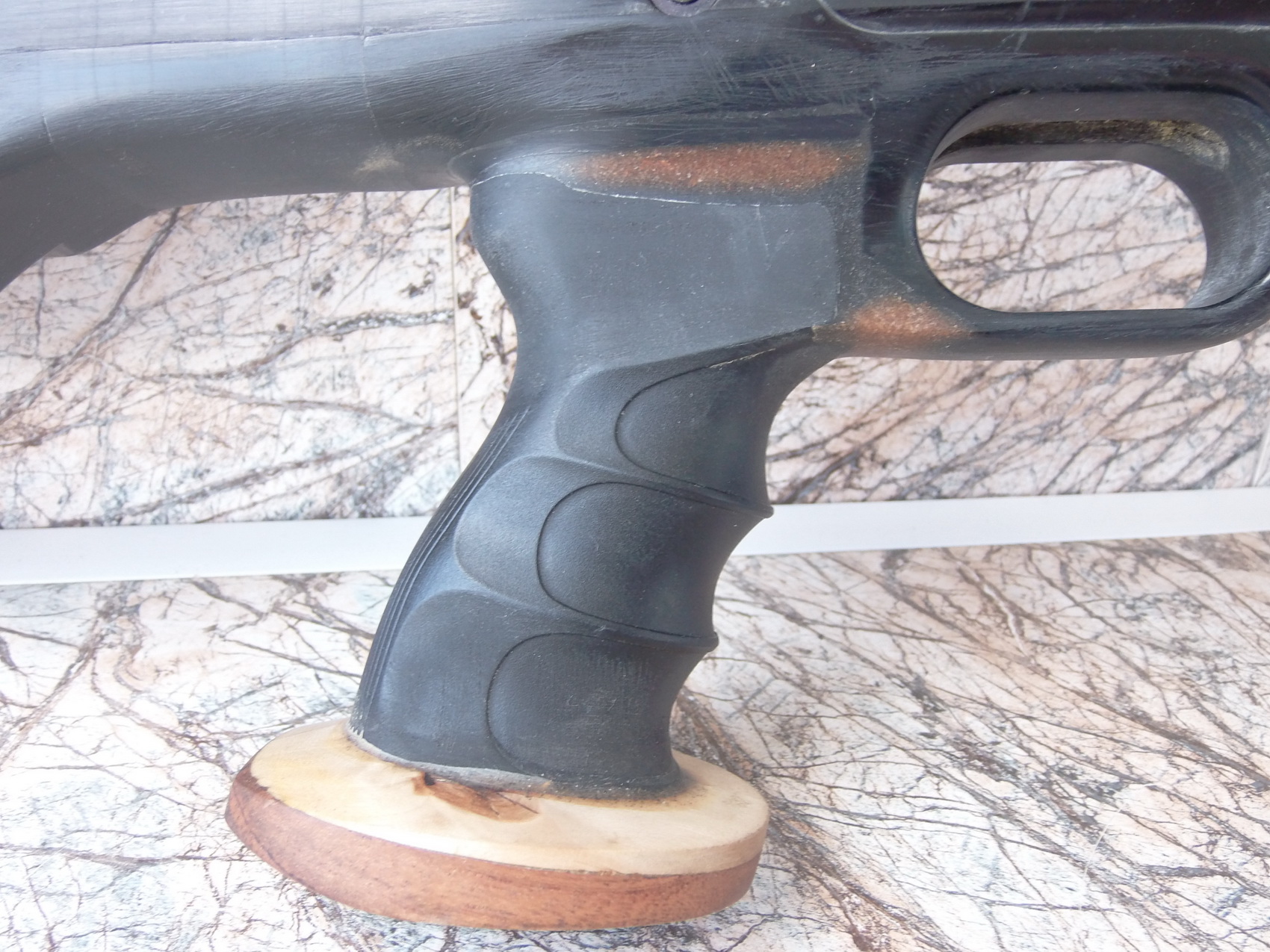 Конечно вы уже рассмотрели и пятку на рукояти-коротко о ней. Её решено было добавить и на этой работе. Их я делал и на недавно изготовленном «пистолете-пулемёте ИЖ-40» и на той самой снайперской винтовке которую показал в самом начале обзора. Пятка на манер немецкой «Н&K PSG-1»-(полицай снайпер гевер модель1). Мне по душе такие пяточки-весьма удобно расположена рука на рукояти и этой как бы полочке. Рука просто отдыхает-достаточно уложить ладонь на пятку и мягко обработать спуск указательным пальцем. В общем решил и сюда её приютить. Из обрезков собрал на клею заготовку, выпилил, сделал необходимую не слишком глубокую выборку под основание рукояти. Однако пятка одевалась на рукоять туго и с характерным щелчком. Обезжирил всё и обмазав хорошенько ЭДП, посадил пятку на рукоять, сразу из остатка клея сделал шпаклёвку с деревянными мелкими опилками и стыки вокруг обработал этим составом-слил пятку с рукоятью в единое целое. После застывания шпаклёвки всё обработал абразивами и вышло так. На сучок справа особо презрительно не смотрите-там всё зашпаклёвано, затёрто и после окрашивания от него и следа не останется. Вышло к слову всё весьма здорово, головку винта не видно: