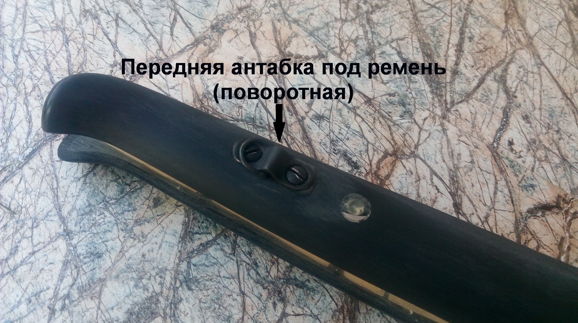 Едва не упустил на мой взгляд важную деталь! Решил сделать возможным крепление на винтовке плечевого ремня для удобной переноски. Ведь на прикладе с обоих сторон были антабки-стало быть и впереди нужно было её сделать. Крепить её было возможным только на боковине ложи ближе к носу цевья. Отыскал тульскую антабку стальную под карабин-т.е. идеально подходил ремешок от АК двухкарабинный. Сделал с помощью «Дремеля» необходимое гнездо и на ЭДП + 2 тульских родных антабке самореза, врезал я антабку по месту:
