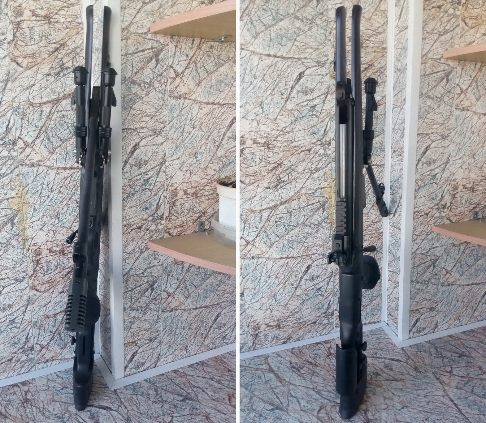 Установочные винты(гужоны) здесь не закручены, а вообще они после поджатия становятся заподлицо с плоскостями ДТК. И вот такая картина вырисовывается. Сошки попавшиеся под руку приладил, о крепеже сошек я расскажу чуть позже, да и сошки будут другие. Ничего не тёрло и не мешало установленному фальшстволу при переломе и взводе винтовки, не мешали и установленные сошки-и разложенные и сложенные. Я сделал паз для перелома под новый ствол чуть больше, но не слишком-с обоих сторон был запас между стенками ложи и фальшстволом около 1,5мм. Пока было так: