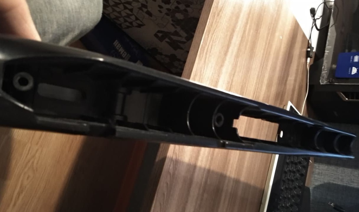 Ложа разбиралась без проблем на две половины( и приклад и основная часть)-это было большим плюсом. Ложа имела много рёбер жёсткости внутри, перегородки, отверстия, пустую шахту под магазин. Чтобы в эту ложу было возможно разместить «Мурку»-требовалось рёбра удалить, а всё остальное заделать вклейкой всяких вставок. К слову расположение шахты магазина( его в комплекте с ложей не было) лично у меня вызвало недоумение. Она была расположена настолько далеко к носу цевья, что элементарно не совпадала с окном экстракции гильз с правой стороны ложи. Не знаю кто это проектировал, но руки отбить не мешало бы))) Вот примерно: