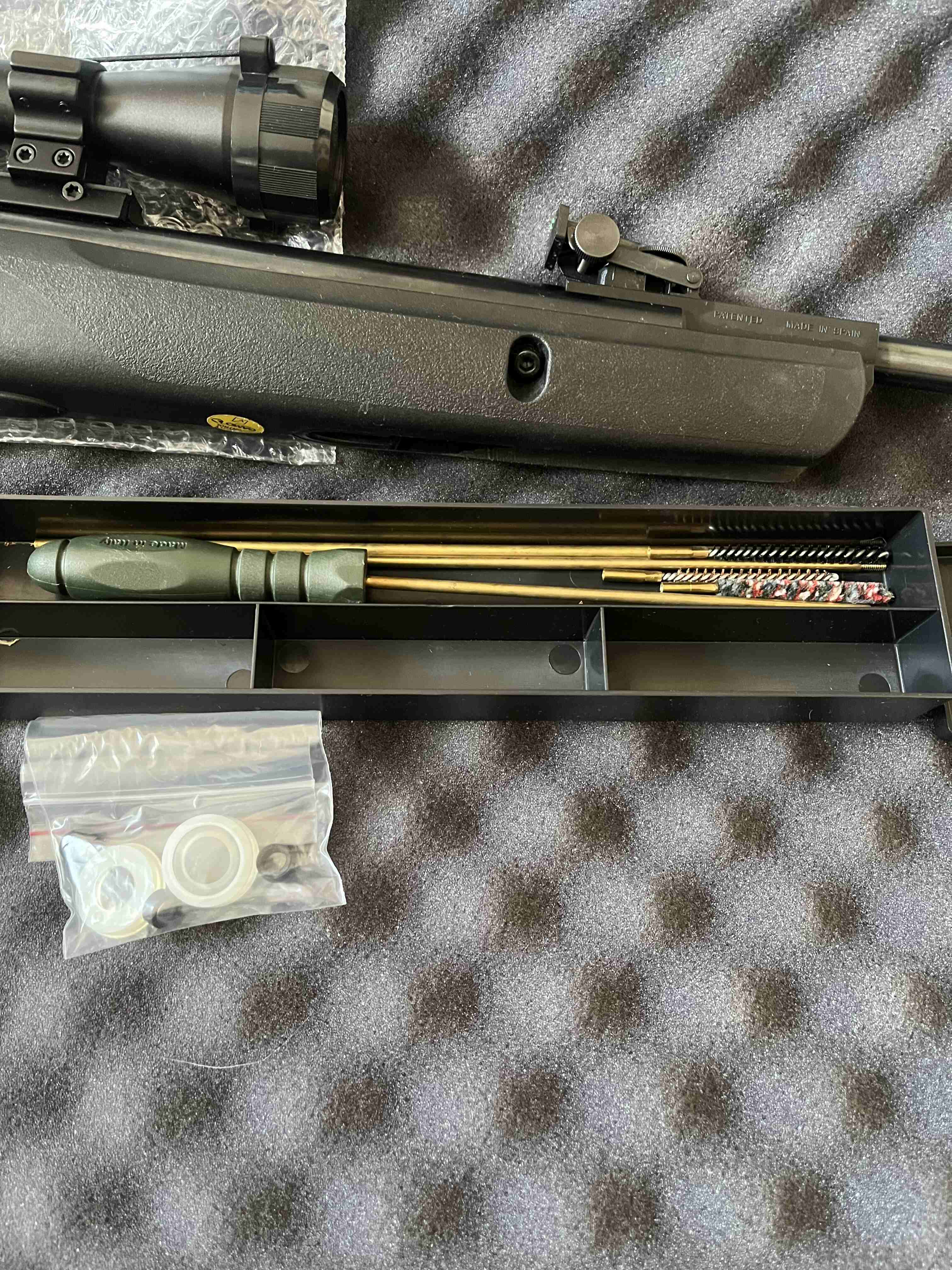 Комплект винтовка, коробки, чехол, 2 банки пулек, очиститель, комплект для чистки (Италия), ремкомплект запасной всех уплотнительных монжет.