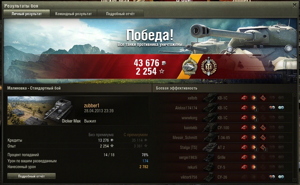 Хлопцы, чво тамака с танками ув вас ? Я тутака продолжаю потроху нагебать .. Кто играл знает как это бывает, турбослив почти всей команды за три-четыре минуты. Однако прорвавшиеся по кругу к базе вражины не учли птшные способности товарышча Зуббера. Зуббер заптшился в леску и завалил почти всех хто остался, ув том числе и обнаглевшую пёршую как обычно напролом АТ-2.. Двух целехоньких тяжей в кругу базы и атшку разобрал практически самолично, влупив каждому по три снаряда. Что особенно прыятна, дык гэто иногда чытать вражския комплименты. :-)