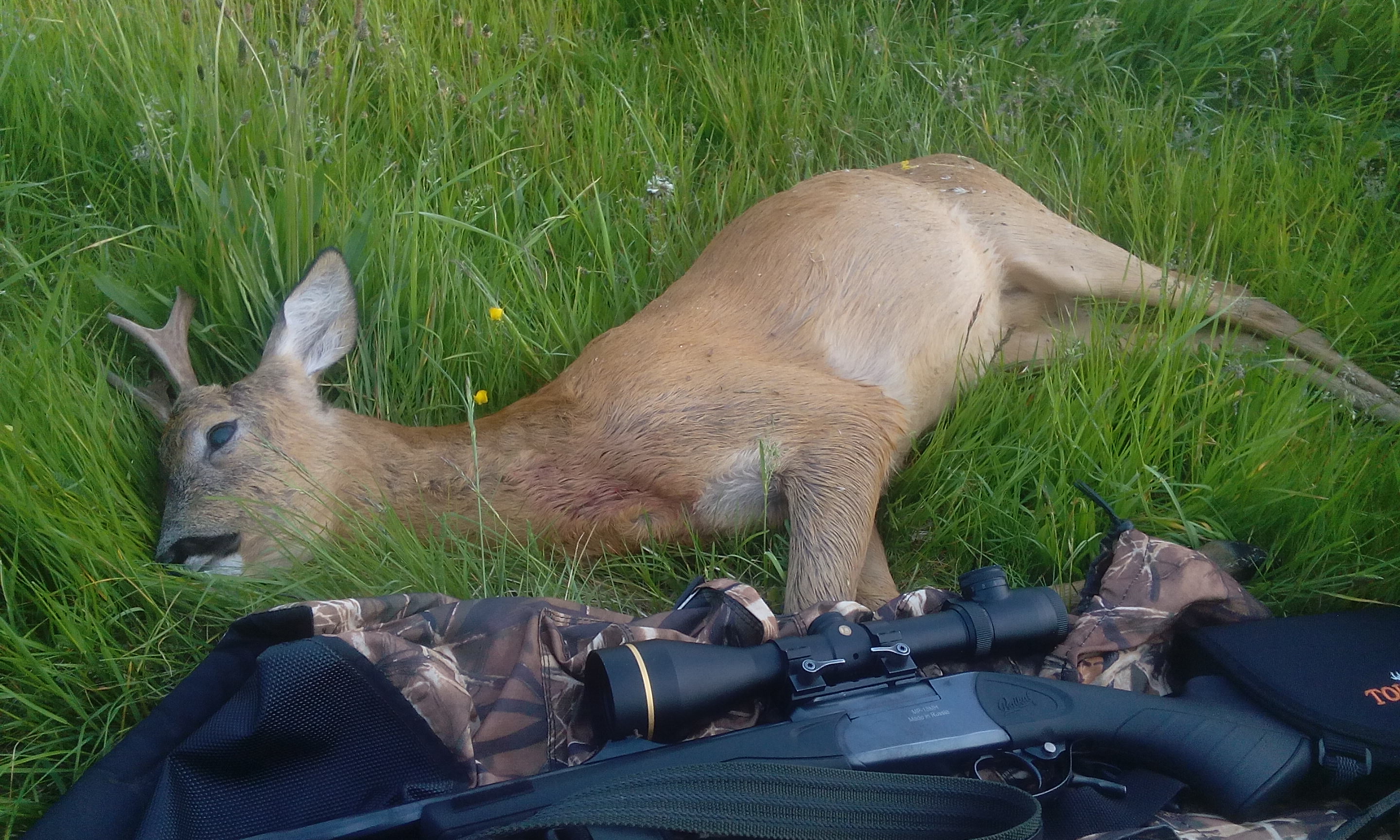 Ильюха писал(а):Сходил на выходных в очередной раз в гости к косулькам. Вечер субботы уже по традиции выдался не совсем результативным. Видел двух самок: одну молодую прошлогодку, вторая с двумя маленькими "карандашами" уже пришла. Кстати та которая с малыми прилетела как угорелая, когда пищал манком писком детеныша - материнский инстинкт силен! Малых кстати не сразу заметил, думал зайцы резвятся в высокой траве. Так они и лазили вокруг до самой темноты. Я их не пугал, тк наличие поблизости козы - лучший манок на козла. Но, увы, две барышни решили этот вечер провести в женской компании. В бинокль обшарил каждый куст - нигде не затаился рогатый. Переночевав в машине в угодьях, еще в утренних сумерках выдвинул обходить места, где вечером пастились самки. Ни одной самки там уже не видел, но в гордом одиночестве прогуливался вот такой не молодой-не старый, полностьювыленявший, в отличие от предыдущего, красавец. После недолгих наблюдений за его боданиями с кустом, красавец был добыт. Хотелось конечно найти с более трофейными качествами, но как есть - так есть. Был бы штыкачь - не бил бы даже - оставил на разводку, а этот вполне себе гастрономический "не молодой-не старый". Ну и про комаров нельзя не отметить. В эти выходные секли они не по детски, причем как утром, так и вечером.Защищался как мог всеми спецсредствами