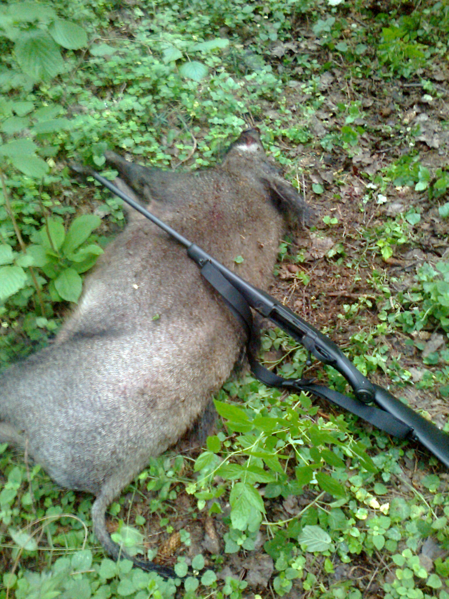 В четверг вечером охотился на кабана. Днем предварительно провел осмотр перспективного ячменного поля. Следов было много, решил вечерком наведаться. В 21-00 уже подхожу к полю, а кабаны уже там, голов 10. Повезло, что ветер был в мою сторону. Вдоль леса начал потихоньку скрадывать. А тут еще дождь меленький пошел. Подошел я к стаду метров на 100. Ну, думаю буду выцеливать перезимка хорошего. Высматриваю в оптику и замечаю движение чуть ближе ко мне на краю леса. Вижу метрах в 70ти выходят еще несколько кабанчиков. Выцелил средненького. После выстрела с места рванул, как заправский спринтер. Но пробежав метров 20 упал. Добирать не пришлось. Карабин Хенель, калибр 30-06, боеприпас Партизан, пуля Гром 11гр. На входе сломано ребро, пробиты оба легких, на выходе сломано еще 2 ребра. Это первая моя добыча этим патроном. В целом остался доволен его действием и результатом. Ну и фото: