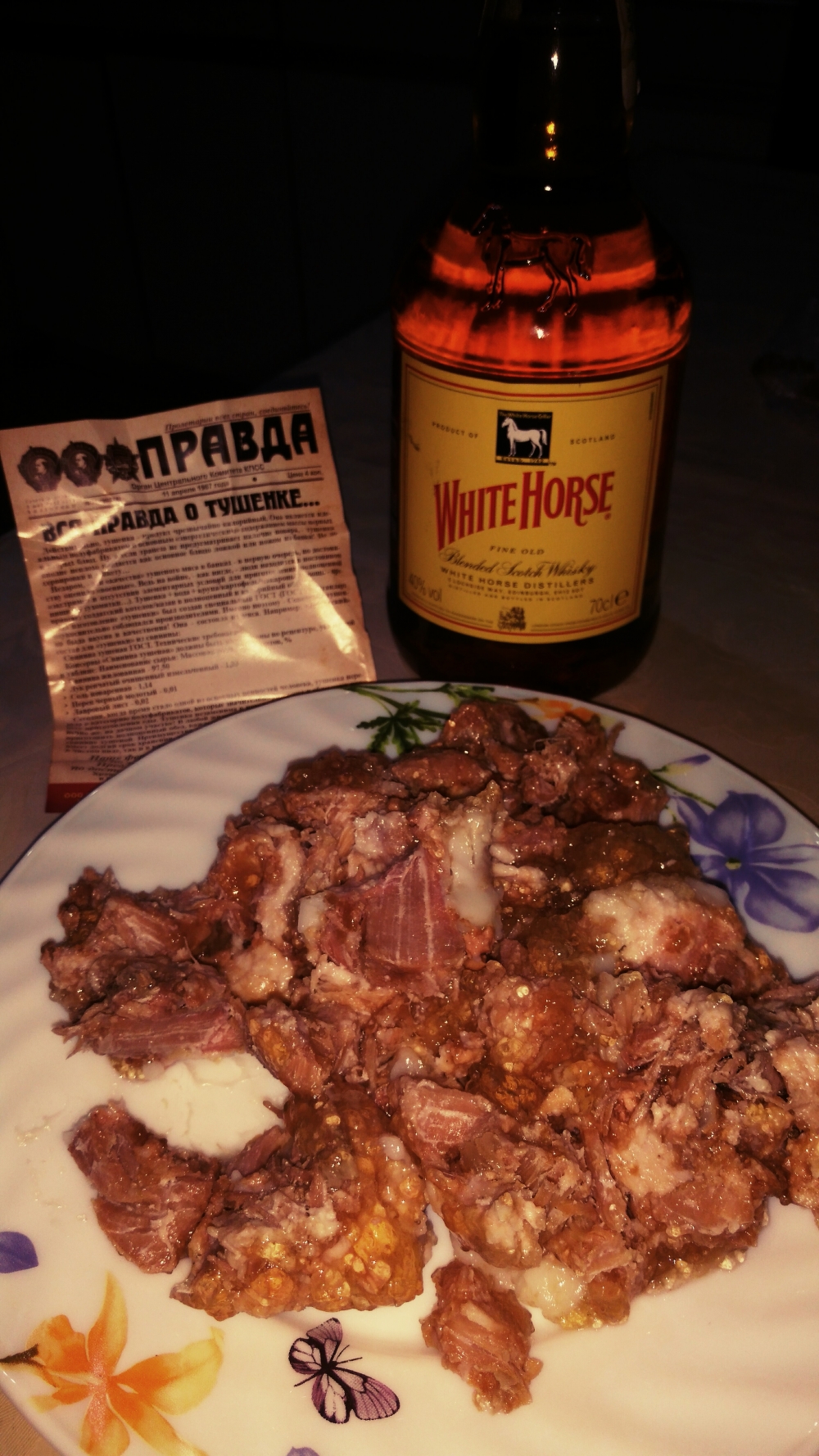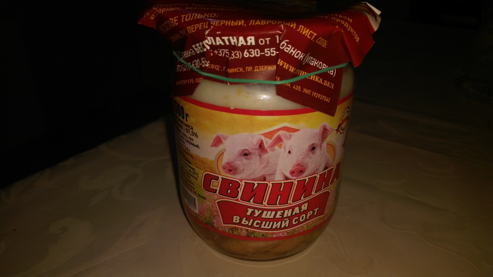 Приехал домой, переоделся, и так и заявил своим, что сейчас буду есть тушенку. Отец, который является постоянным напарником на рыбалке, тоже сходу заявил, что не намерен сидеть в комнате перед телеком, зная, что на кухне я трескаю тушенку. Впрочем пока он собирался с мыслями, я внимательно рассмотрел продукт.