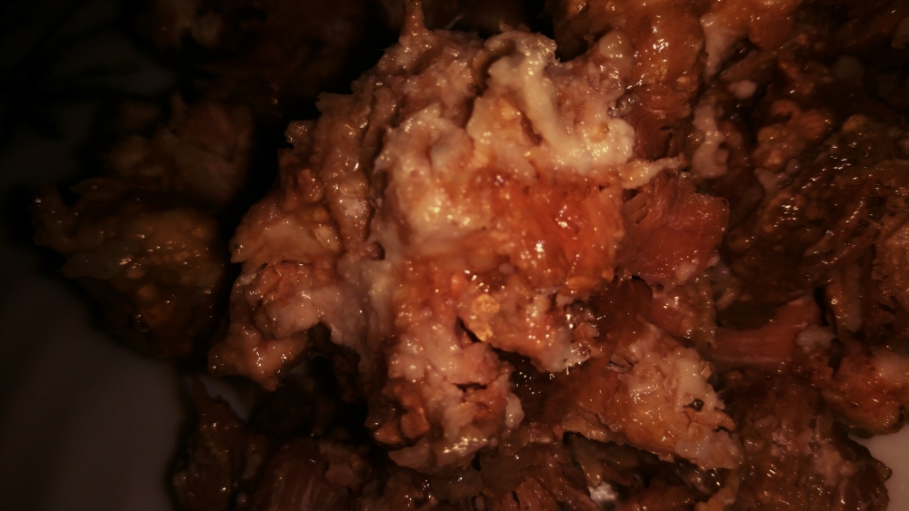 На вкус отличное мясо. Ничего лишнего, все в меру (соль, перец и другие специи). Не скрою, поковырял вилкой, поэтому на фото может показаться, что все в кашу. Это не так, кусочки хорошие, нежные, тают во рту а не в руках!