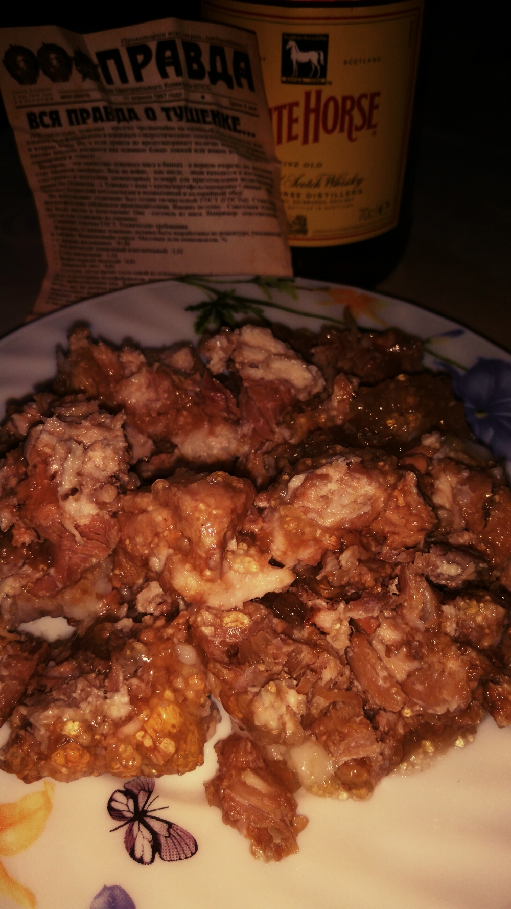 Далее, уже почти с маниакальным удовольствием я начал выворачивать содержимое банки на тарелку, и дабы показать всю естественную красоту содержимого банки, т.е. мяса. Пришлось сообразить этакий настольный натюрморт для картинки... Во общем судите сами.
