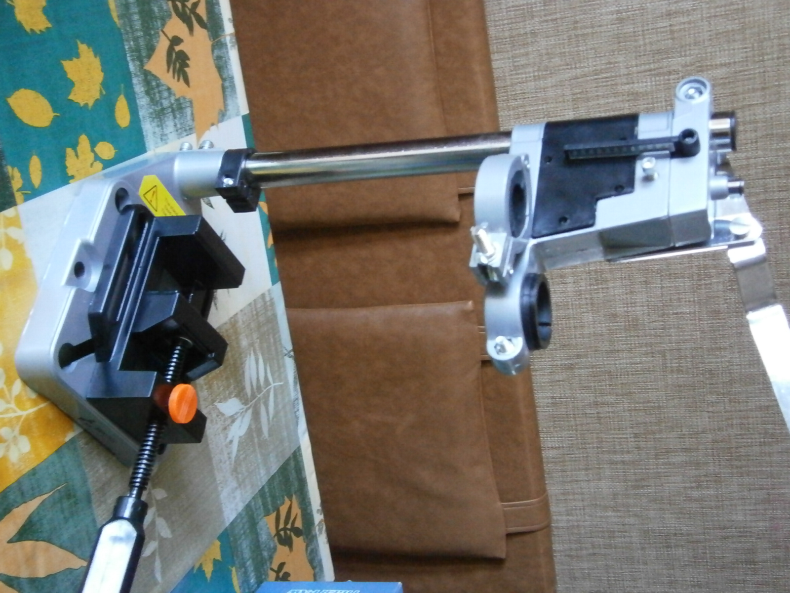Стойка регулируемая по высоте, имеет 2 вкладыша под разный диаметр дрели. Также есть боковое крепление (для чего -ХЗ). Ход шпиделя -60 мм. Отдельно комплектуется тисками с губками 60мм и кнопкой разблокировки винта.