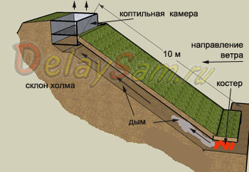 В плотном (желательно в глинистом) грунте крутого берега роется длинное (1,5- 2 м ) наклонное углубление (штольня). Там, где штольня выходит на поверхность земли, над ней устраивается "колосник": на решетку из металлических прутков или можжевеловых палок укладывается ряд или два ряда небольших камней (колосник нужен для задержки пламени). Над колосником сооружается труба, достаточно широкая, чтобы в ней можно было разместить рыбу. Трубу делают из дерна, камней, других подручных средств. Хорошо для этой цели подходят старые деревянные или железные бочки без дна. Трубу сверху накрывают крышкой, отодвигая которую регулируют величину отверстия для выхода дыма. При этом нужно следить, чтобы рыба не прикасалась к стенкам и друг к другу. Перед подвешиванием каждую рыбку обвивают несколькими оборотами шпагата, чтобы она не развалилась во время копчения.