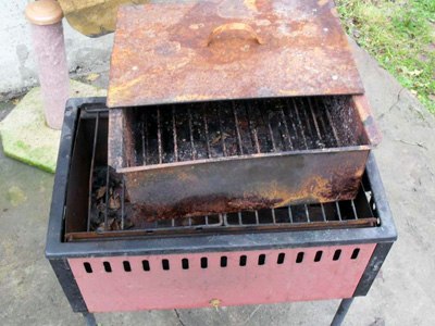 Дымокур - это камера, где тлеют угли и образуется дым. Для дымокура берется лист кровельного железа необходимого размера, который сгибается П-образно. Получается потолок и стенки дымокура. Из того же материала изготавливается и задняя стенка дымокура с заранее сделанным отверстием под дымоход. Очень хорошо иметь и переднюю стенку, ею можно регулировать тягу.
