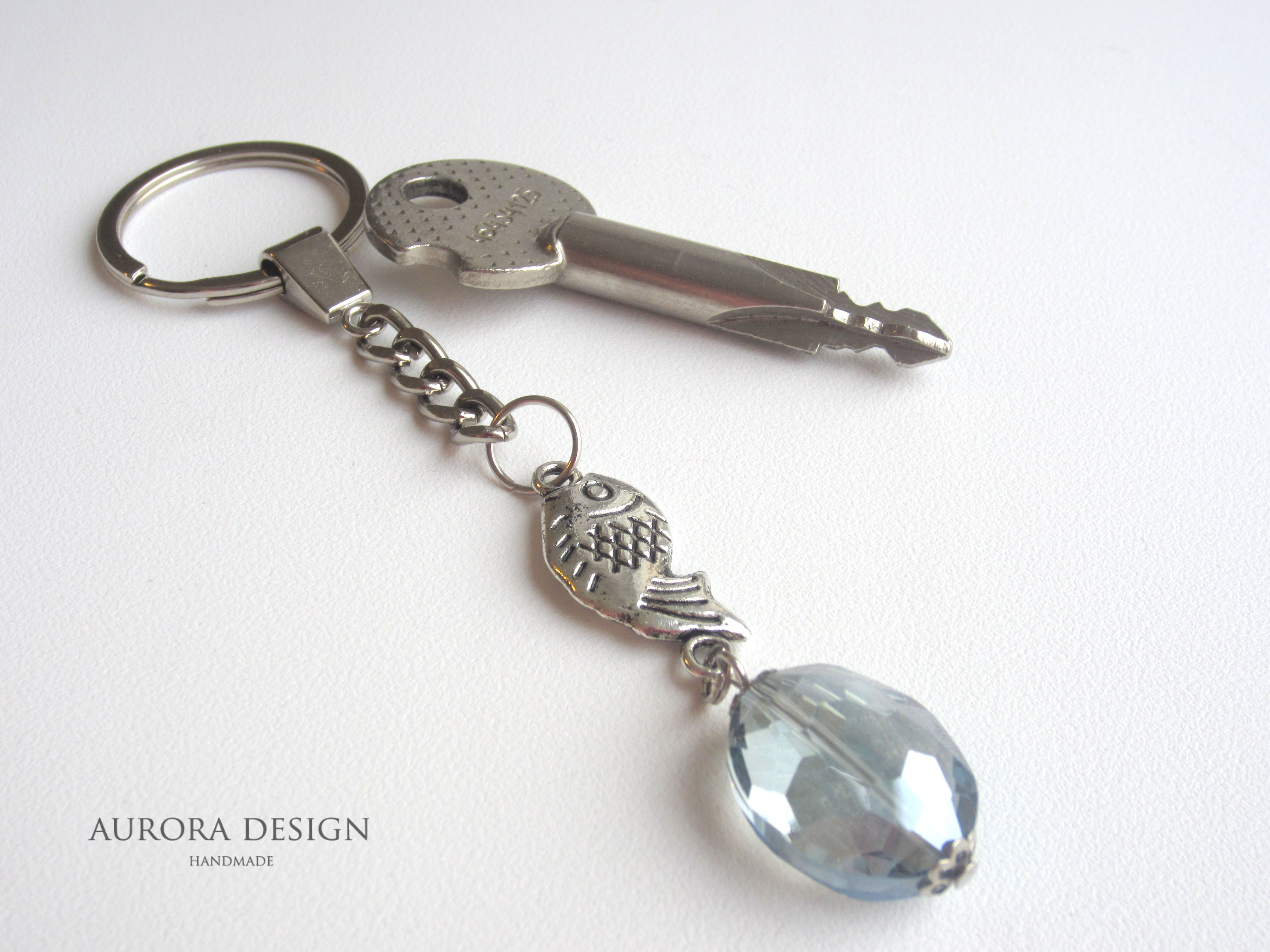 15. Брелок рыбка. Длина подвески на кольце 10см. Размер рыбки (металл) – 3см. Размер камня (хрусталь) - 2,5см. Диаметр кольца – 3см.