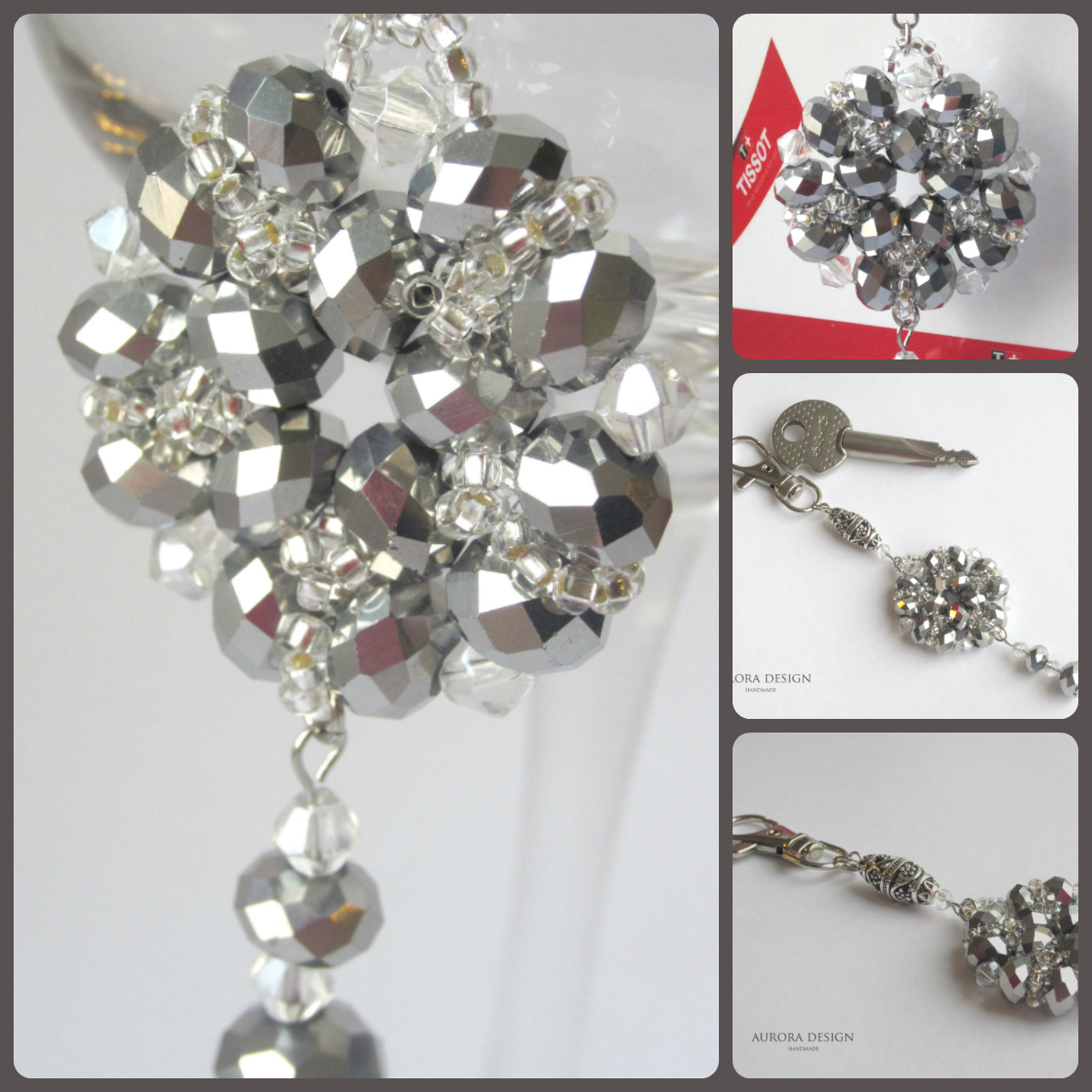 16. Брелок цветок. Длина подвески на карабинчике 10см. Бусина (металл) – 2см., элемент подвески цветок (австрийские кристаллы, чешский бисер) – 3см. Карабин – 4см.