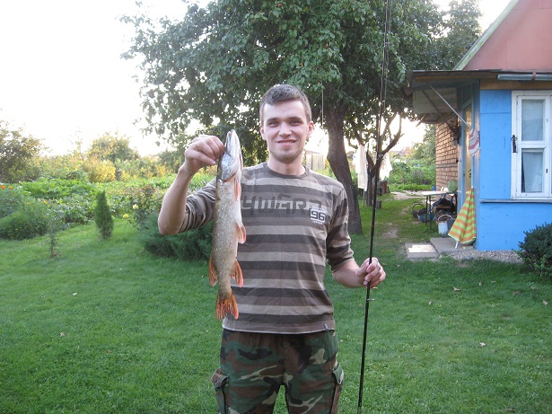 На выходных был у тещи на даче, сделал небольшую вылазку со спином на Свислочь, не серьезно, букально на полчаса (пока готовился ужин :-): :dr_ink: ) - благо дом на самом берегу практически. Речка так себе, довольно грязновата... :) Но, буквально второй заброс принес зубастую, тянулась очень приятно, кидал с мостка вдоль берега, взяла далеко, тянул против нехилого течения, рыбка делала несколько свечей, во время которых был уверен что уйдет, мысленно попрощался уже с уловом.... ) подтянул к мостку - возникла другая проблема - чем брать, попытался достать рукой не хватало где-то около метра, решил рисковать и поднимал наверх на весу... немного помучив ее внизу, дождавшись пока замрет.