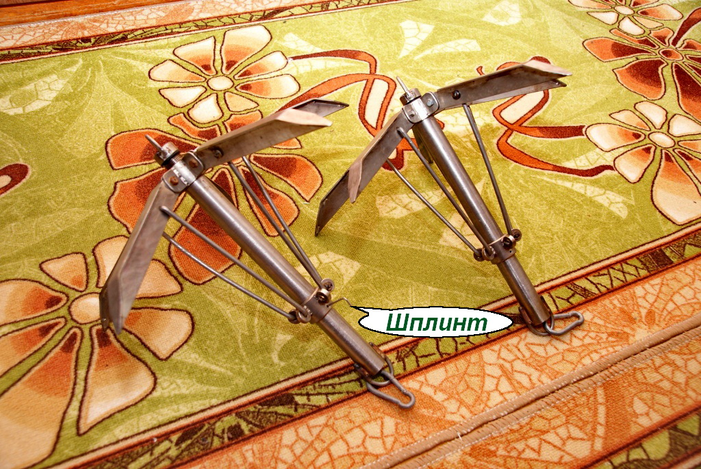 Шнур капроновый 6 мм. так как с таким удобнее работать, он не путается, не скользит в руке и можно в любом месте завязать временную петлю которая потом легко развязывается. На катушке на фото намотано 12 м. шнура, катушка плавающая (с пеной внутри, ее можно при зацепе отстегнуть и выбросить за борт, об этом ниже...), имеет ограничитель размотки шнура и используется с крюком для больших глубин, или для двух "якорей" при ловле на поплавочн. удочки так как шнур по концам оснащен двумя карабинами. Второй шнур использую для мелководных озер 2-3м., он оснащен крючком который легко цепляется за детали лодки и можно при зацепе его легко отстегнуть без подъема "якоря", а потом приплыть и пристегнутся на свое место т.к. на конце шнура есть поплавок в виде пэт бутылки. В пробку бутылки нужно герметично зафиксировать крепление а бутылку положить на некоторое время в морозильник, тогда когда вы быстро накрутите пробку бутылка раздуется, станет твердой и не будет мятся при транспортировке. На крючке есть второй отвод для того чтобы при нужде укоротить шнур, прямо на него можно было бы накинуть временную петлю. Шнур в местах соединения с карабинами и т.д. прошит, обтянут термоусадочной трубкой (меньше узлов, меньше грязи) и в местах контакта с металлом в петли вставлены куски распиленной желобообразной нерж. трубки загнутой в кольцо во избежания перетирания. Сам крючек выгнут из нерж. электродов и также обтянут термоусадкой. Конструкция (с крючком) опробована в течении прошлого сезона, и проявила исключительную удобность при ловле на спиннинг в заросших камышом, богатых на надводные зацепы местах.