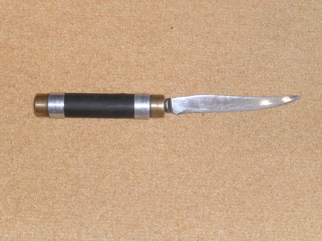 А если ножик поуже и покороче сделать? и спаять две гайки жопками,тогда выкрутив и перевернув ,лезвие прячется в ручку,тебеж не на того медведя ходить :-)