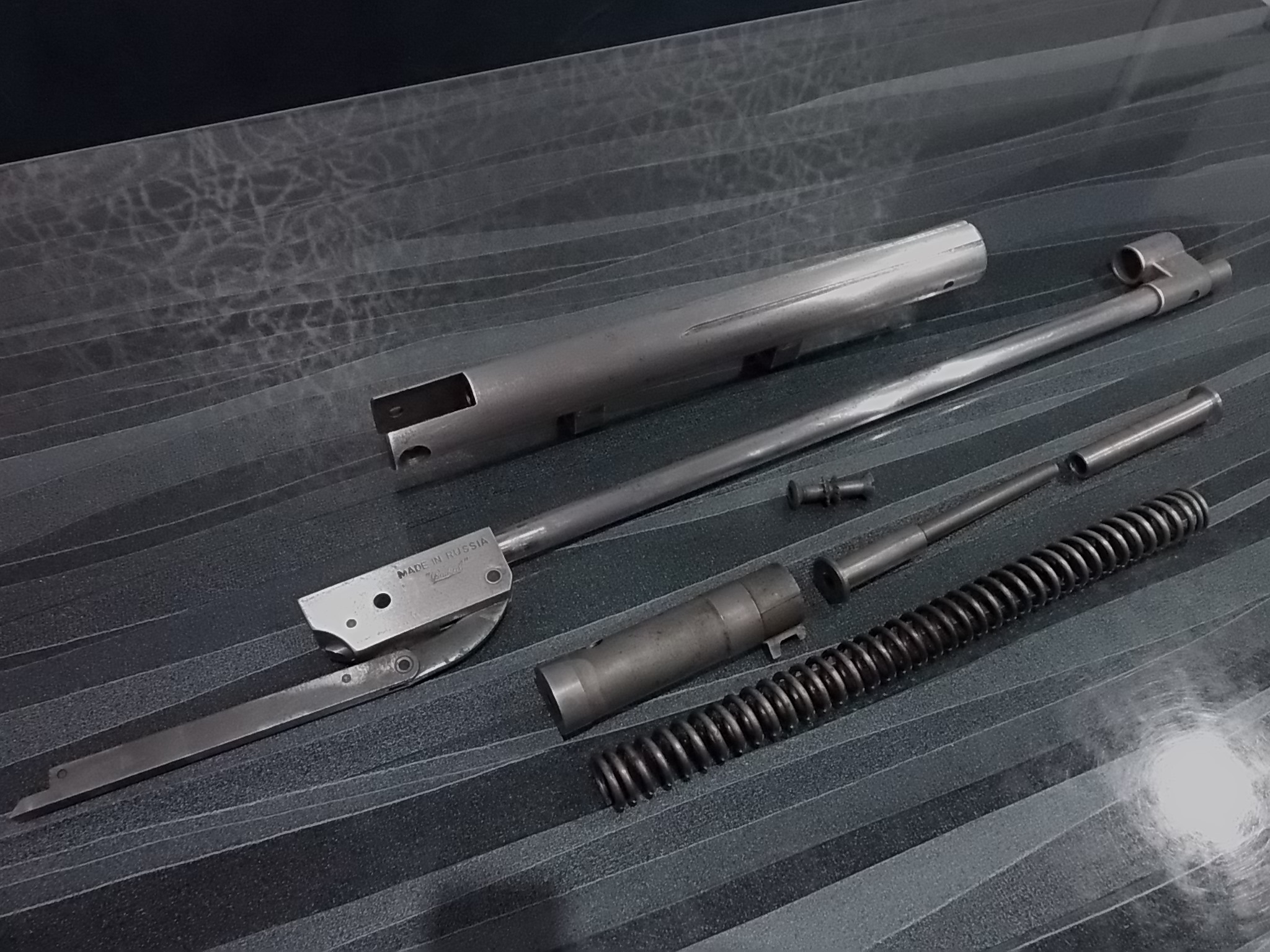 Наверно не верил он,что из этого что-то будет в итоге.Хотя по совести сказать не верил и я,что удастся сделать из найденного что-то путное и рабочее.НО! Попытаться то можно? Первым делом отмочил уксусом,потом WD-40 крепёжный винт ствола-очень хотелось надеяться,что ствол «живой» и контейнер в мусоропроводе пока будет чище.Открутил всеми правдами и неправдами…Глянул-ВУА-ЛЯ!!! Жив зараза! Ржавчины ноль-одна грязь да пыль! Таким же путём отмочил штифт-нужно было разобрать и глянуть в нутро компрессора.Снял УСМ,разобрал до последней детальки,кинул в уксус.За часа четыре отмокло всё,оросил всё снова ВДшкой,оставил на несколько часов-протёр мягкой тряпочкой,и всё засияло родным воронением.Собрал УСМ-всё отменно работало. Вытащил из компрессора и остальной набор. Ну остальное было только в помойку.Выщербина на поршне,манжета кожаная(точнее что от неё осталось) в тряпки,плюс ко всему даже сапожные гвоздики были в ней.Пружина вся ржавая до не могу, деформированная, капитально подсевшая,перепуск отсутствовал вовсе. Ну собственно примерно в таком виде ИЖ достался мне:
