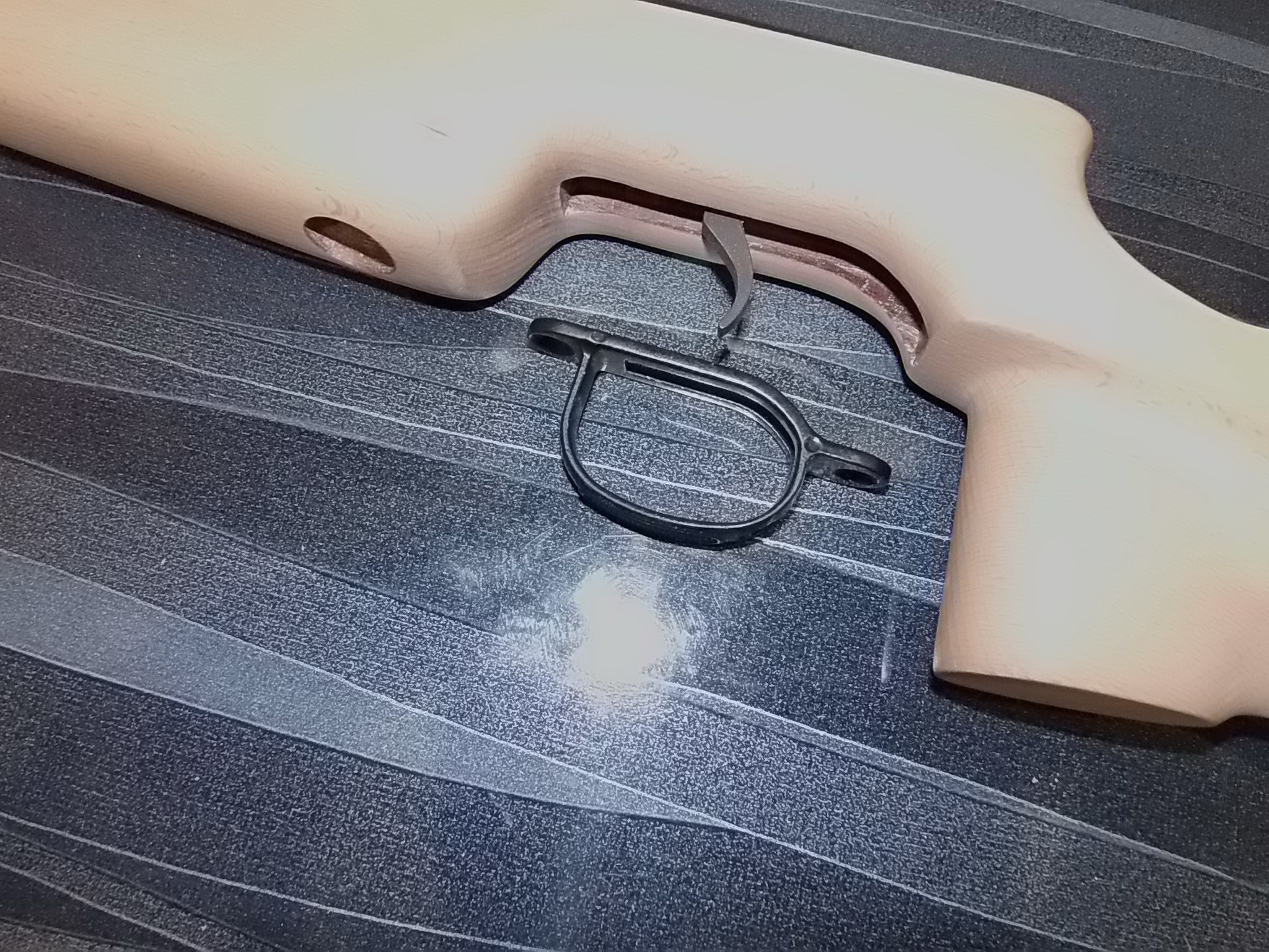 Также требовалось доработать и затылок компрессора-довольно куцым был он. Оттянуть компрессор к задней части ложи перед шейкой возможности не было-во первых крепить сзади было бы не за что компрессор,во вторых-спусковой крючок упёрся бы в ложу перед рукоятью.Да и предполагаемая скоба спускового крючка должна была стать не так в задумках.Потому вклеил в ложу за затыльником с УСМ берёзовый брусочек на ЭДП.Прежде всего-заделал имевшуюся пустотку в этом месте,а к тому же было за что крепить скобу спусковую.Как раз и Дима Профессор скобу прислал к месту.!!! Димка,СПАСИБО!!! Вот и она самая: