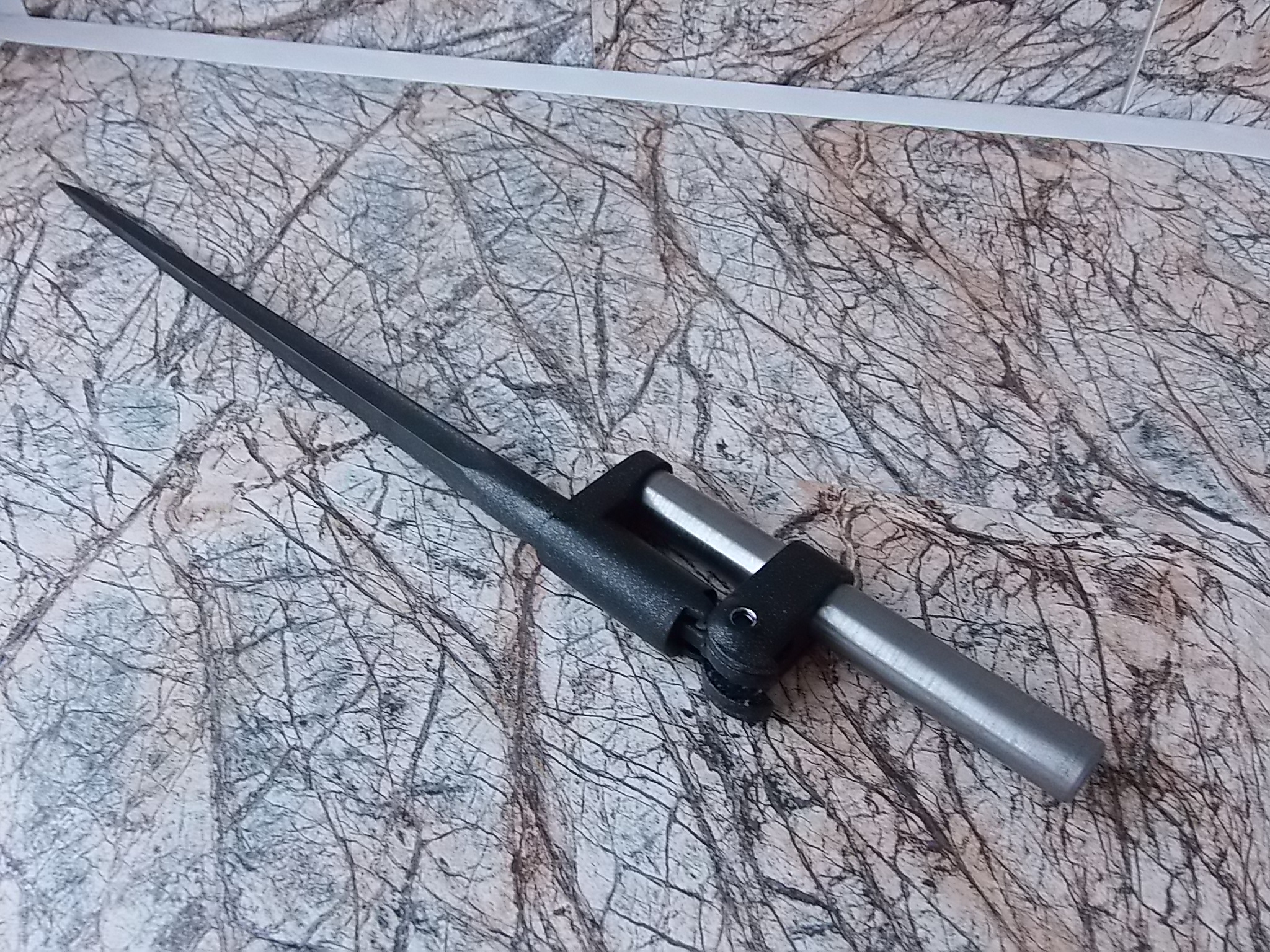Первый "клык" отвечает за фиксацию штыка в сложенном виде. Мы второй решили не делать. Учитывая что в штыковую атаку не нужно ходить,он достаточно надёжно за счёт хорошей пружины и надульного кольца работает.