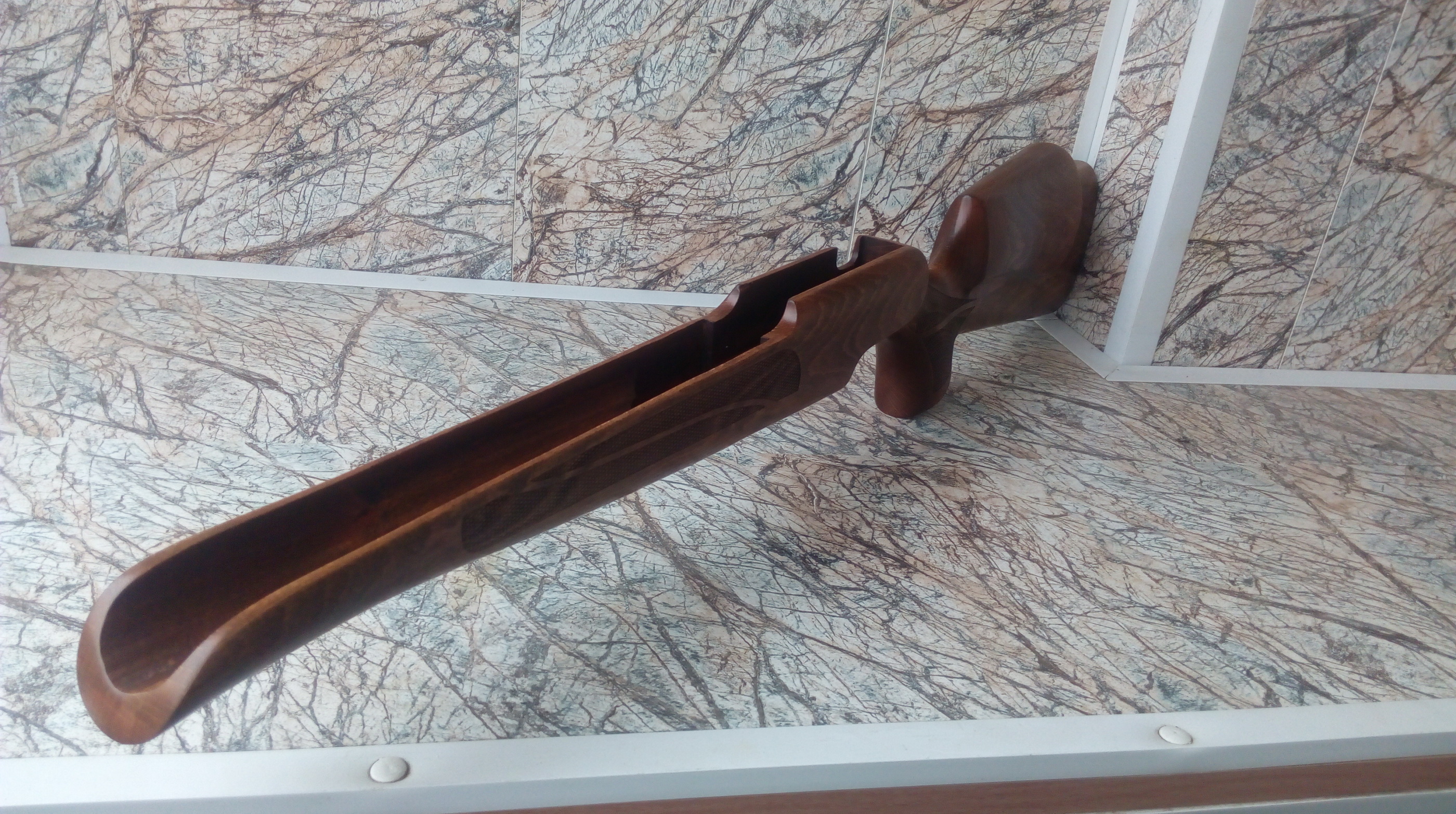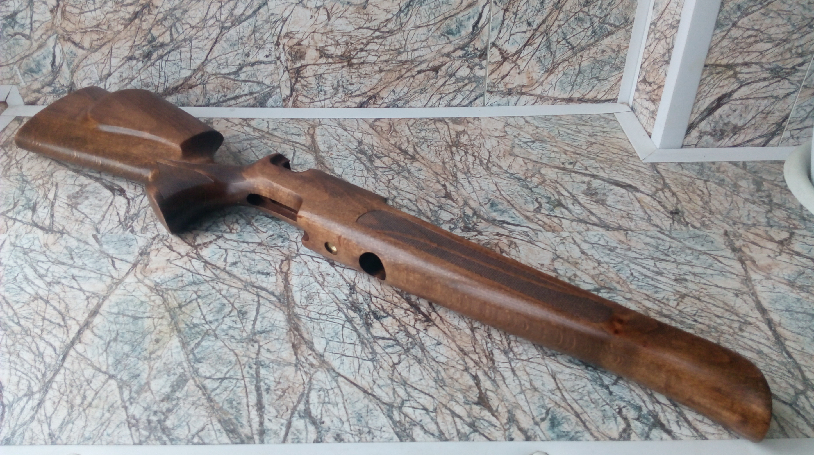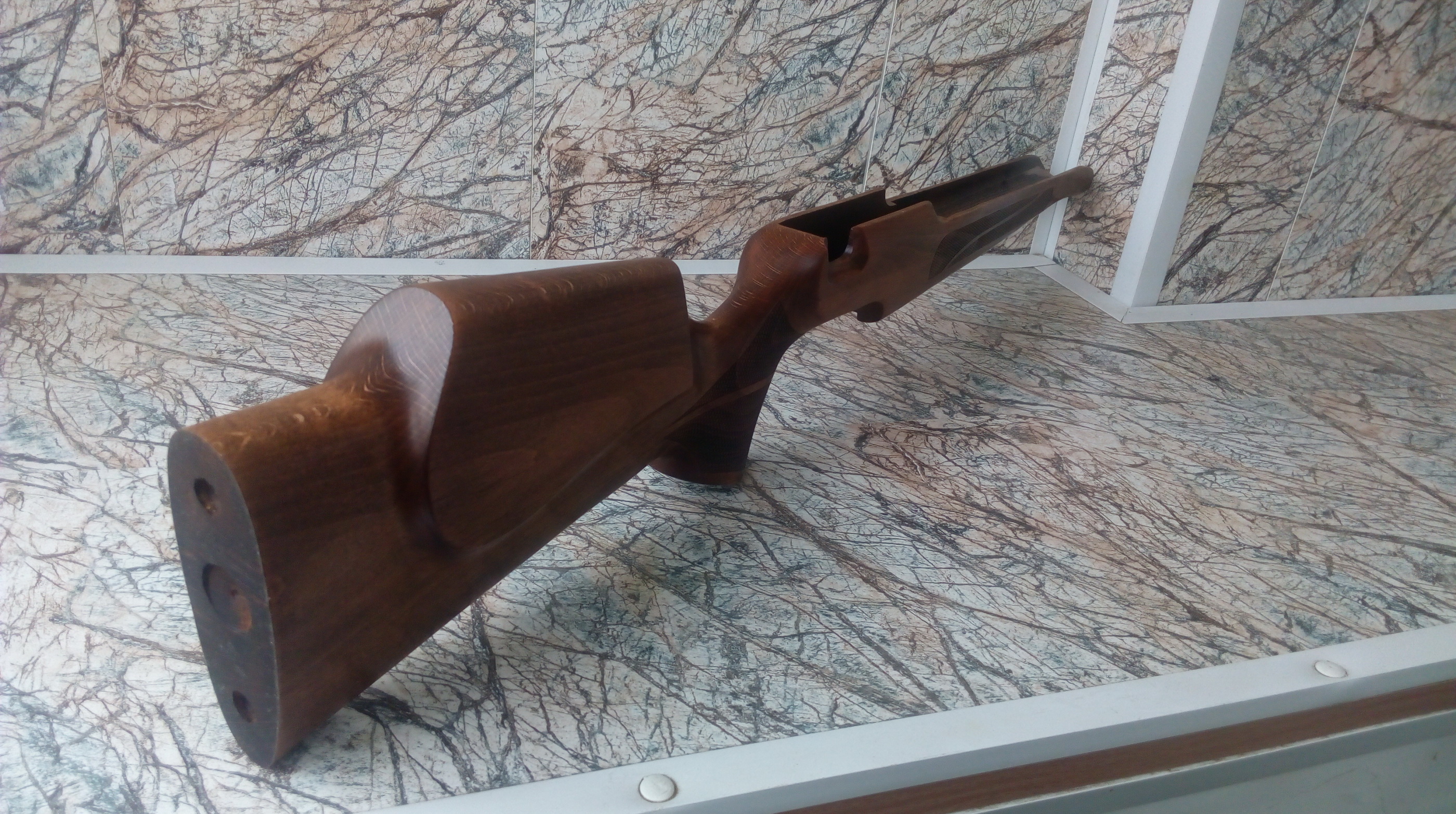 Прежде всего окрасил ложу морилкой водной "Дуб",добавив немного "Палисандра". Владельцу как и мне нравятся ложи более класического цвета. Окрашивал с помощью тряпочки-т.е. ложу натирал смоченной в морилке и хорошенько отжатой тряпкой. Сделал два подхода,не ожидая полного высыхания,взял чистую мягкую тряпочку и смочив в гор.воде,хорошенько отжав,растёр нанесённую морилку. Это помогает удалить лишнюю морилку,разводы,открыть лучше текстуру дерева тем самым и сделать цвет более равномерным. После по высохшей ложе прошёлся "Миркой" с зерном 2000-2200. Дерево стало едва ли не зеркальным. Вот таким: Теперь можно было приступить к пропитке. Применялось масло льняное отбеленное в этих целях. Натёр несколько раз ложу-дерево охотно питало масло,потому не жалел его. Немного дал в подвешенном состоянии деревяшке напитаться маслом. И после растёр ложу мягкой тряпочкой,отправил на трёхдневную сушку в подвешенном состоянии в тёмной кладовке. Вот высохший первый слой: Как видите текстура стала уже более отчётливой в сравнении после нанесённой морилки. С периодичностью в сутки нанёс ещё два слоя. Третий в принципе можно было и делать,но сделал. В итоге уже такой оттенок приобрела ложа: Далее пришло время Дэниш Ойл. Был остаток как раз на одну ложу-цвет неопределённый,смесь масел Дэниш. Там и светлый и тёмный орех+чёрного ореха немного. Наносится равномерно растирая на 30 минут,затем той же тряпочкой чуть оживляется нанесённое масло. Оставляем на 15 минут ещё и после чистой мягкой тряпочкой хорошенько растирается деревяха. Надо убрать все подтёки,разводы,оставленные пальцы обязательно! Т.е. практически насухо растереть ложу необходимо! Первый слой нужно также посушить пару-тройку дней. Так первый слой Дэниш Ойл сработает на манер грунтовки-закристализуется в порах и последующие слои постепенно будут приносить полуглянец. Вот после первого слоя Дэниш ложа: Как видите текстура после этого масла стала ещё красивее и выразительнее. Было сделано ещё 3 прохода-по одному в сутки. Технология такая же как и с первым слоем.Последний слой нужно основательно высушить не менее 4-х дней! И после этого вот такой оттенок имела ложа "Крала": А теперь шерстяной старый шарф и хорошенько необходимо натереть пропитанную ложу. Ну чтобы добиться приятного бликования. Ну конечно! Не должна быть ружейная ложа как скрипка Страдивари. Но какую-то элегантность должна и она иметь. Верно? Ну и вот-покрасивше стала палочка: Ну и в таком вот виде ложа была отправлена владельцу на дополнительную полировку и окончательную сборку. В общем и целом думаю он остался доволен итогом,лично мне итог понравился. Особенно когда увидел "Крал" в сборе. Вот собственно и финальные фото-дома и на свежем воздухе. Красиво мне кажется и практично: