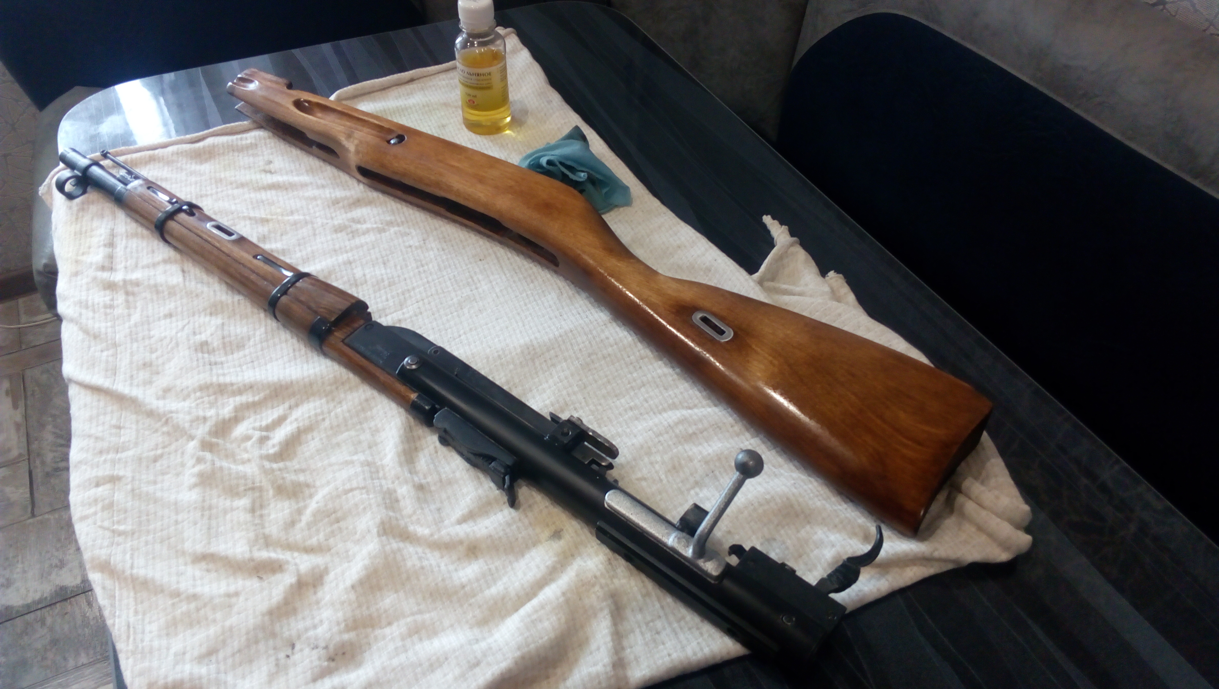 Мой карабин как помните (кто не видел-ссылка: Cсылка скрыта. Для просмотра необходима регистрация на форуме или войдите на форум. ) выполнен на базе «ИЖ-38С»,ну а этот предстояло смастерить на базе «Мурки». Разумеется был готов что карабин выйдет несколько большей длины. Компрессор 512-ой винтовки как и ствол конечно длиннее 38-го ИЖа. Как и для моего был куплен комплект от карабина Мосина обр.1944 года-он с характерной впадиной справа на ложе под складной штык. В комплекте была ложа,ствольная накладка, ложевые кольца, пружины под них, шомпол, ремень с подремешками, нагель в ложу был вкручен также, антабки врезаны. Комплект этот также был со складского хранения,от души дерево было намазано какой-то непонятной субстанцией схожей с солидолом или основательно припылившимся машинным маслом. В общем конечно предстояло в первую очередь привести дерево к нормальному состоянию-очистить комплект от этой грязи и отшлифовать.