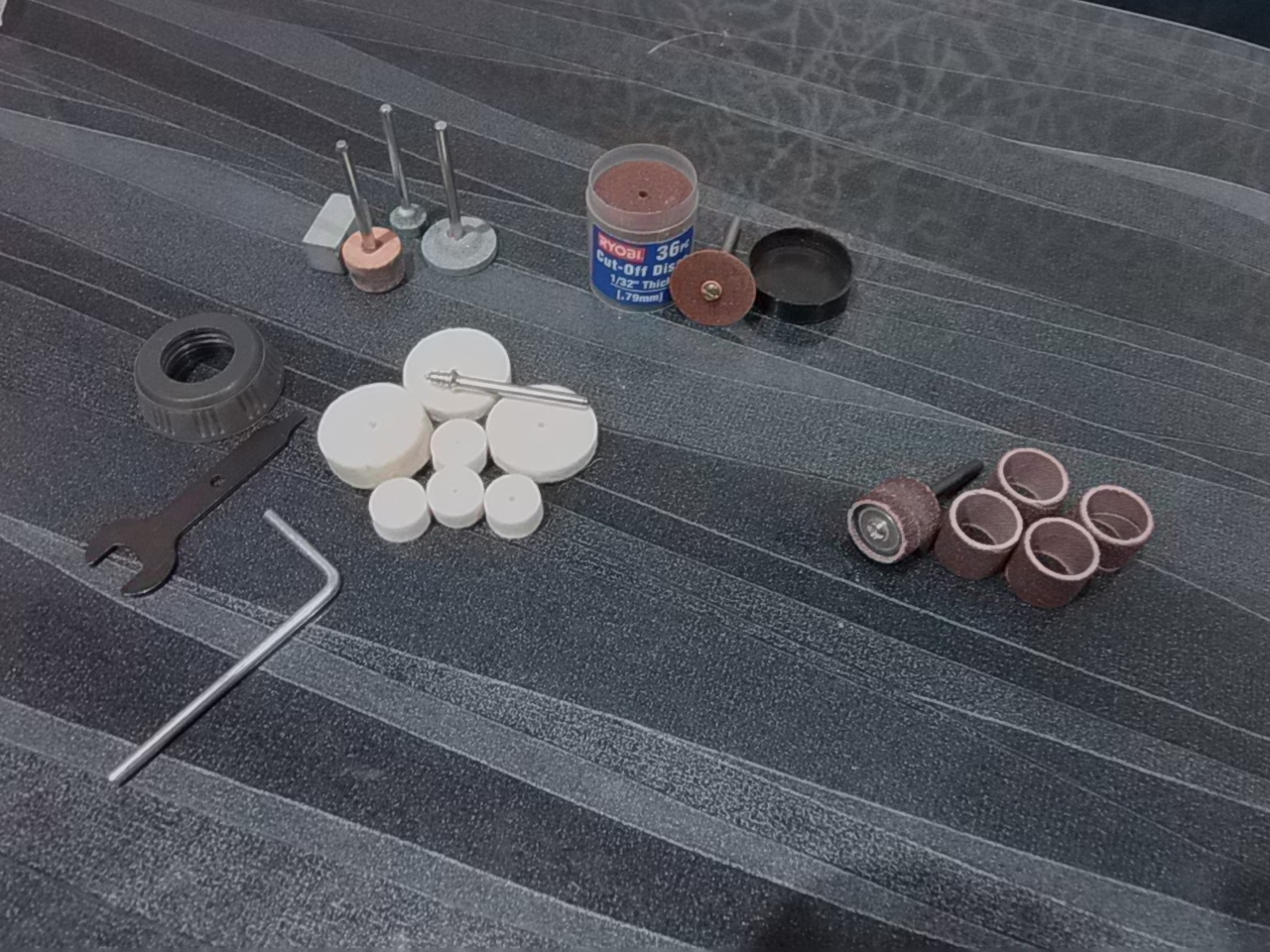 Несколько насадок-под наждачные кружки,баночка отрезных/шлифовальных кружков,войлочные кружки+вал-саморез под них,три абразивных кружка+брусочек абразивный.