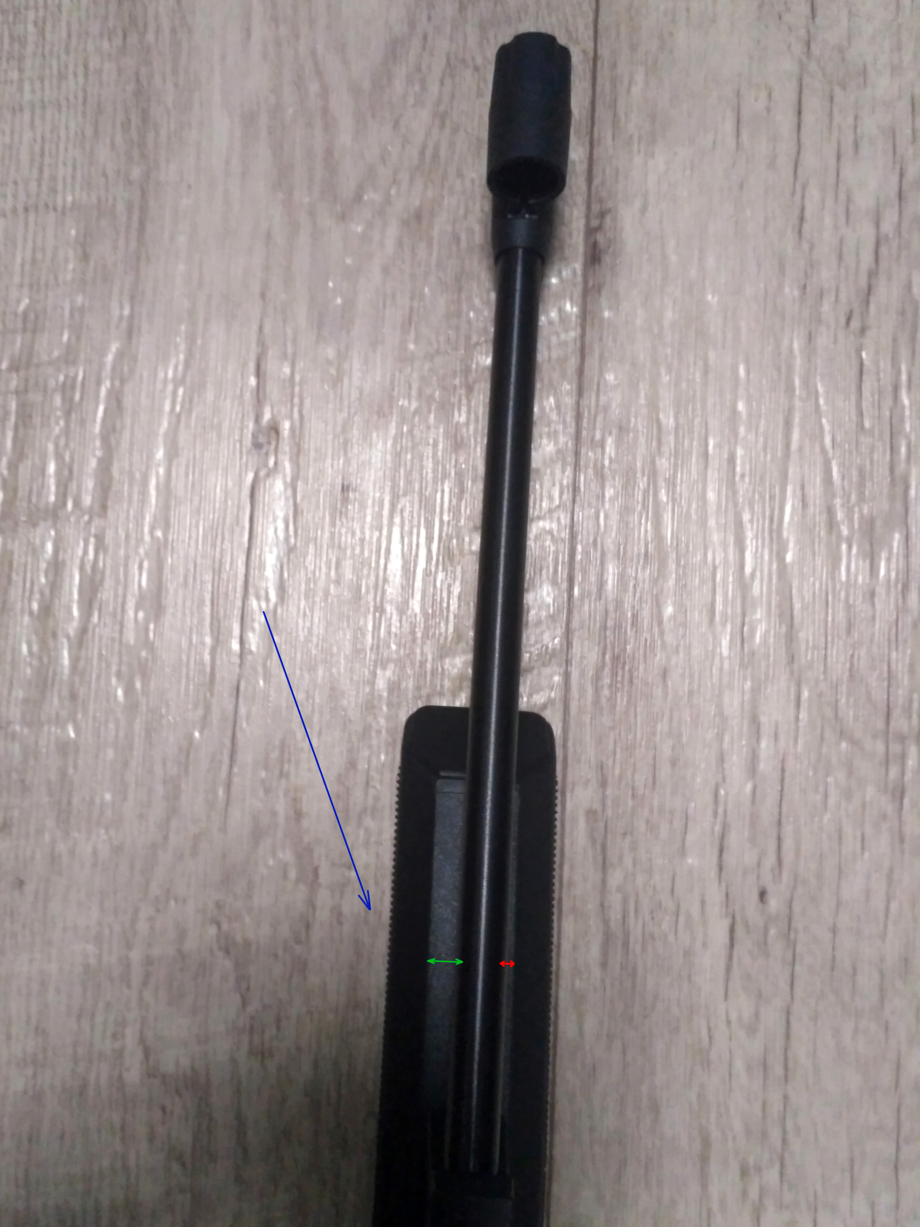3) помимо смещения вправо, ствол идет еще и под углом относительно цевья, если смотреть сверху