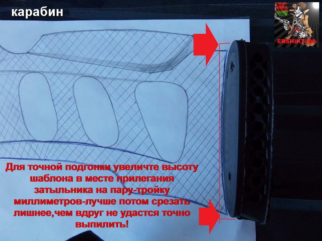 Также при наброске эскиза на затылке приклада внимательно подойдите к размеру(точнее к высоте)резинового затыльника.Положив его на бок и приложив к окончанию Вашего приклада точно обведите его прилегание,высоту рисуемого эскиза увеличьте выше затыльника на пару миллиметров,лучше потом срезать лишнее,чем не хватит!!!