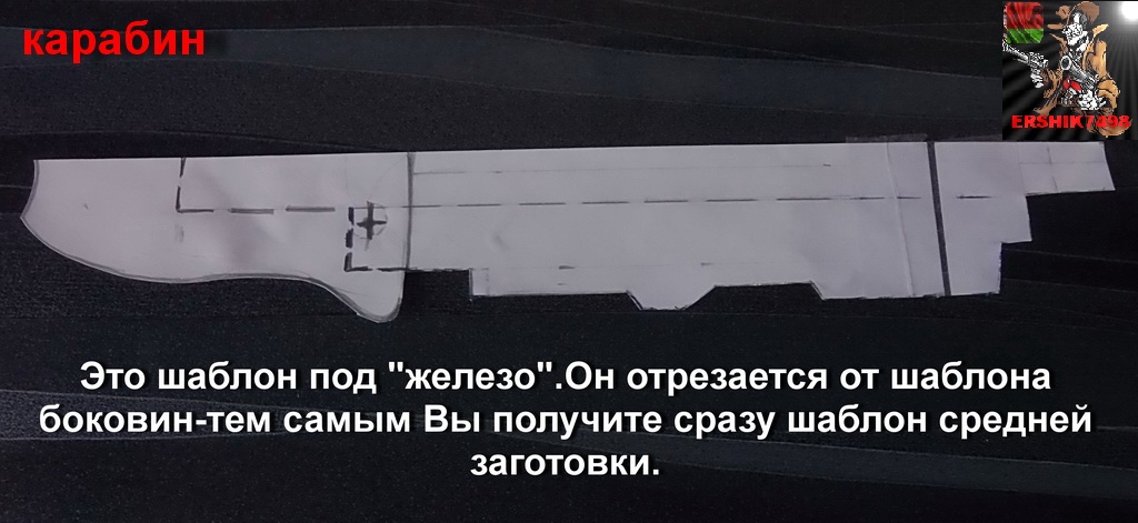 Итак,теперь нужно уложить на картон или ватман снятое «железо» с рассчётом на то что будет добавлен приклад,то есть с запасом(я использовал 2 листа А4 склеенных скотчем в альбомной ориентации с задней стороны.Острым карандашом как можно точнее обрисовываем контур снятого «железа».Теперь под линейку выравниваем обведённый контур,снова сверяемся.Учтите при рассчёте скобы спускового крючка,что перед ним предохранитель,а он должен свободно двигаться!Вот так:Затем дорисуйте задуманный Вами контур всей будущей ложи,учитывайте длину своей руки,высоту глаза при прицеливании относительно прицельных приспособлений.Советую на прикладе предусмотреть «щёчку»,не столько для красоты,а для того чтобы при прицеливании не напрягать шею, «щёчка» поможет тут,на точности стрельбы это также отразится,поверьте!А вот больше наверно для красоты и эстетичности дам совет купить резиновый затыльник на приклад-с ним он будет очень красивым,это тоже честно.Купить его можно в охотмагазине-выбор их большой,Вам нужен шириной не более 47мм в самом широком его месте,чуть уже(до 35мм тоже сгодится).Я решил сделать приклад «скелетного» типа прежде всего чтобы уменьшить его вес,да и нравится мне этот тип прикладов.На своей версии я разумеется не настаиваю-Вы можете его сделать любой формы,той которую Вы посчитаете для себя идеальной и интересной прежде всего Вам,поэтому тут решайте сами.Я же видел данный приклад,точнее похожий,в одной из передач на канале «Охота и Рыбалка»-такой приклад был у одного немца на винтовке,правда более мудрёный и с прекрасной отделкой.Что касается пистолетной рукоятки-применять ли родные накладки,или сделать рукоятку своей формы также решите сами.Главное учтите размер своего кулака,ну и конечно удобность её.Мой полный эскиз ложи будущего карабина был вот таким:Обязательно,с особым вниманием отнеситесь к разметке отверстий для крепёжных винтов «железа».Это действительно очень важно!Кстати-нижний винт будет заменён впоследствии на винт под шестигранник,так как отвёрткой Вы потом его не сможете основательно зажать,(что весьма важно)из-за того что Вам помешает это сделать нижняя часть скелета приклада.А вот шестигранником Вы сможете это сделать без проблем.Далее Вы увидете как приготовить это место крепежа.