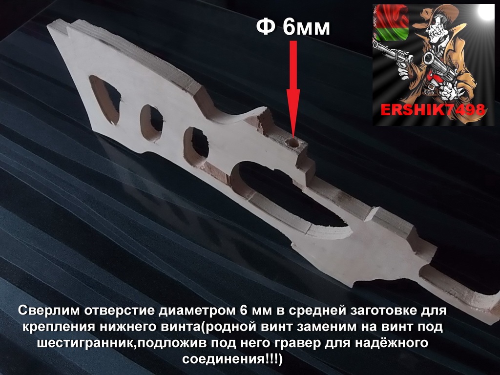 ПОСЛЕ РАСПИЛИВАНИЯ ЗАГОТОВОК ОТСЫПЬТЕ СЕБЕ НЕМНОГО ОПИЛОК,ПРИМЕРНО СТАКАН- УВЕРЕН ПРИГОДЯТСЯ!!!!После вырезания трафарета средней заготовки у вас останется трафарет «железа».Аккуратно и точно по месту приложите его с внутренней стороны боковых заготовок и переведите,отметьте места под крепёжные винты как можно точнее.Это последний подготовительный шаг перед изготовлением ложи!Переходим к непосредственному изготовлению новой ложи «карабина».