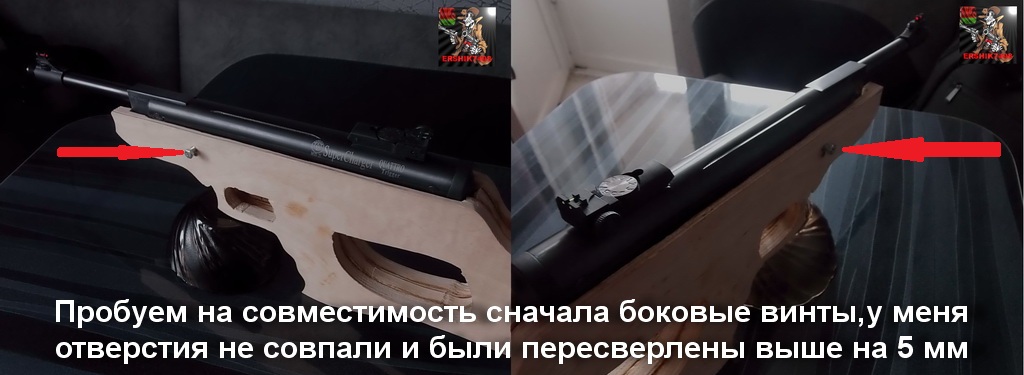 Для удобства работ,не склеивая заготовок сначала проведём предварительную выборку под железо.Делать это на фанере очень удобно,так как листы шпона проклеены одинаковой толщины,сбиться с линии практически невозможно,тем более листы проклеены в разных направлениях,зарезав лишнее Вы сразу это увидите по направлению волокон на шпоне.Берём «железо»,и замеряя все размеры штангелем проводим выборку стамесками и ножами.Учитывайте что у Вас ещё будет и средняя заготовка толщиной 15мм.Сделайте выборку поочерёдно на обоих боковых заготовках постоянно примеряя «железо» к ним.Затем сложите все заготовки и попробуйте вставить «железо».Делайте всё неспеша и обдуманно аккуратно перенося размеры,замеренные штангелем на фанеру.У меня всё получилось так как на фото:Теперь на боковинках нужно просверлить крепёжные отверстия под винты диаметром 5 миллиметров.Будьте аккуратны,я к слову ошибся!!!Затем просверлим отверстие диаметром 6 миллиметров под нижний крепёжный винт в средней заготовке строго под прямым углом и также строго по центру заготовки.Сразу скажу что на этот винт будет при сборке одет гравер,а на гравер положим шайбу-это поможет чтобы винт с гравером не продавил древесину.Пистолет при взводе достаточно тугой,при взводе мы будем применять усилие на ствол,следовательно задняя часть «железа» будет стремиться поднятся.Винт нужно будет зажать достаточно туго,но без фанатизма,чтобы не наломать дров,сорвав резьбу в «железе».Тоже касается и боковых винтов-под них нужно будет положить обязательно шайбы!Теперь мы подошли к склеиванию заготовок нашей ложи.