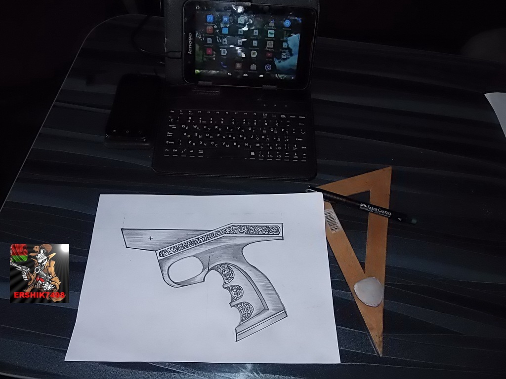 Нарисовал эскиз,всё продумывая по железу пистолета.Лично мне понравилась верхняя часть заводской ложи,поэтому строить заново велосипед я не стал,изменил слегка для удобства наклон рукоятки,добавил в ней выемки пальцев,увеличил высоту рукояти,изменил чуть форму скобы УСМ.Получилось вот в итоге: