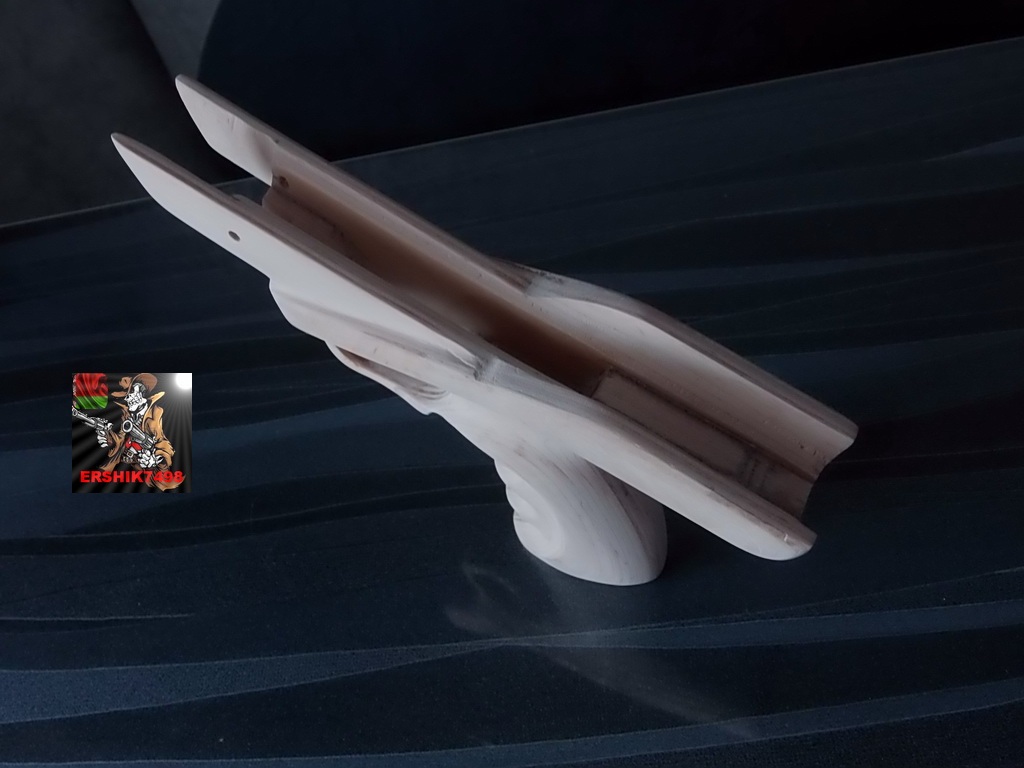 Понял тебя,Сергей!Прочитал оба поста...Ссылки сейчас просмотрю,люблю глянуть на всякого рода самодеятельность!Что касается чёпика-дело в том что планировал же прокладочку между ним и рукоятью,отказался-закрасил прокладку,а во вторых-за счёт чёпика с прокладкой увеличивал длину рукояти,потому и выпиливал заготовки с расчётом на добавку этих элементов.К полной эргономике здесь не стремился-делал удобную под обе руки,как просил Димка...